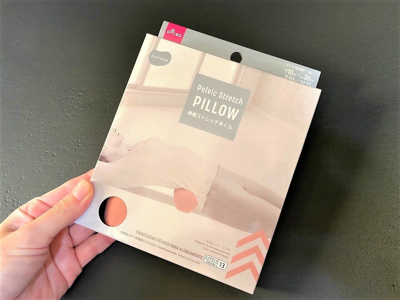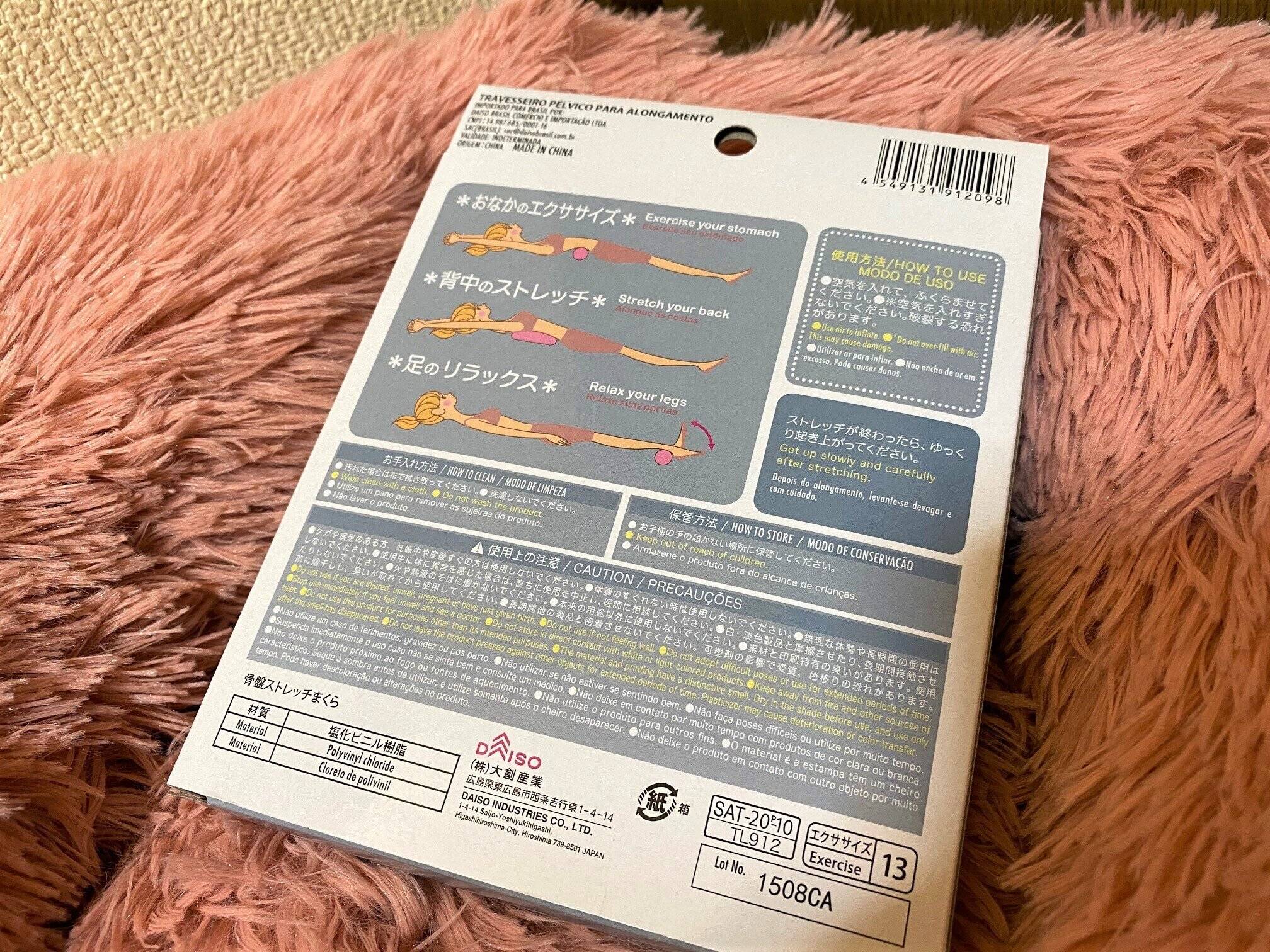 100円ショップ『ダイソー』で売っている「骨盤ストレッチまくら」。値段は100円。空気を入れてふくらませ、その上に背中や腰、脚を乗せて使うストレッチまくらです。
