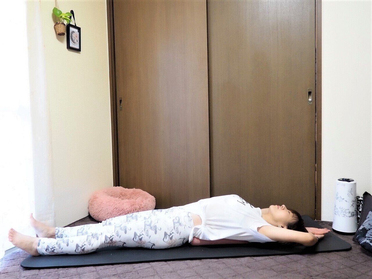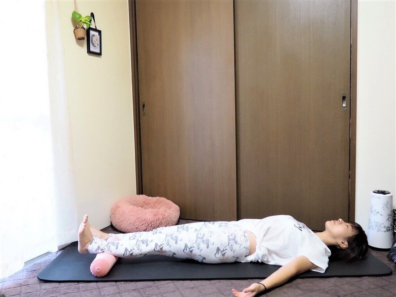 横向きにして置いたら、その上に腰を乗せ仰向けの姿勢で体重をあずけます。
