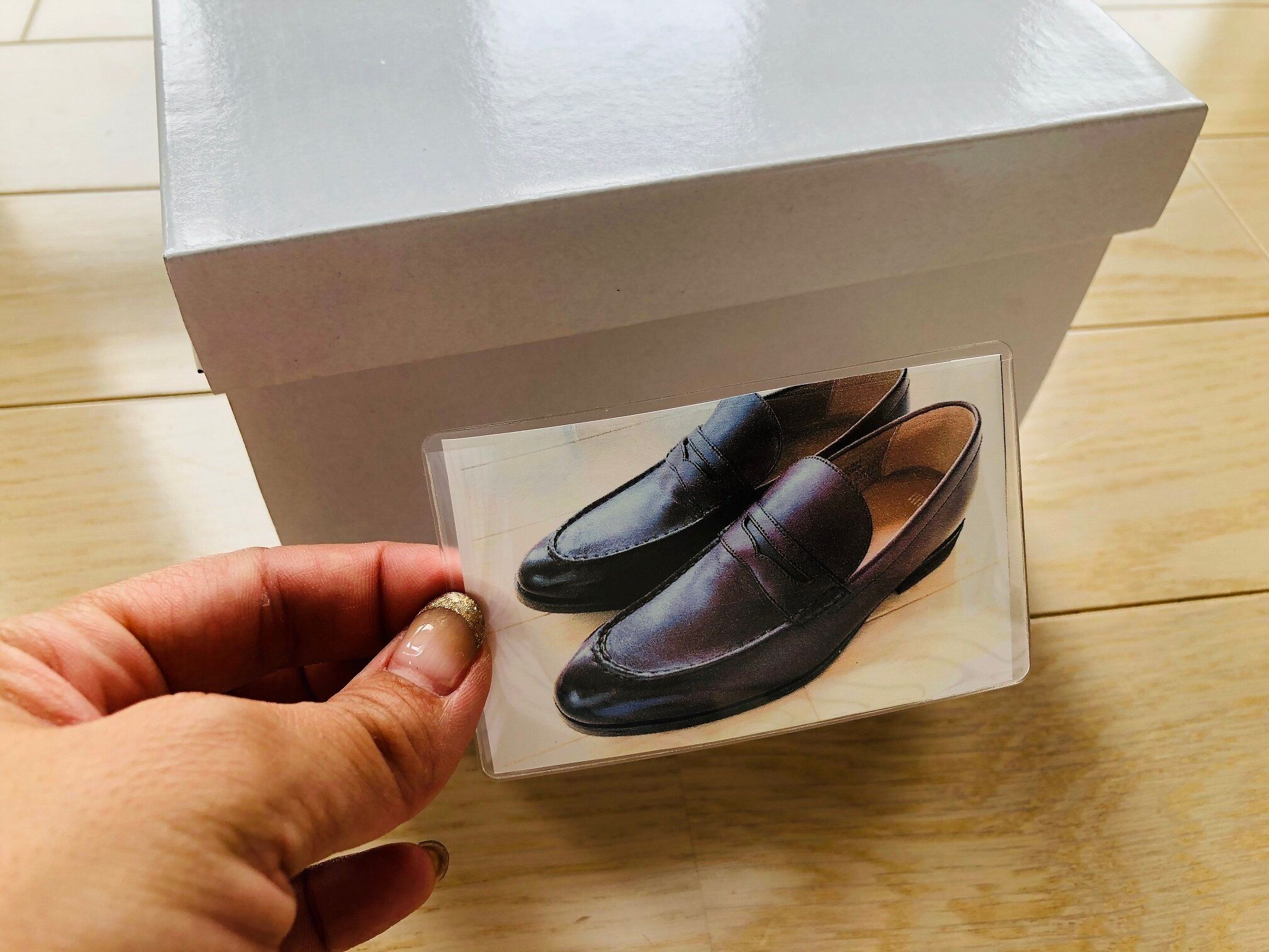 箱に入っている靴の写真を撮ってプリントしたら、それを「貼れるカードホルダー」に入れればOK!ホルダーの裏面には粘着シールがついているので、箱の側面の見やすい位置にペタっと貼るだけです。