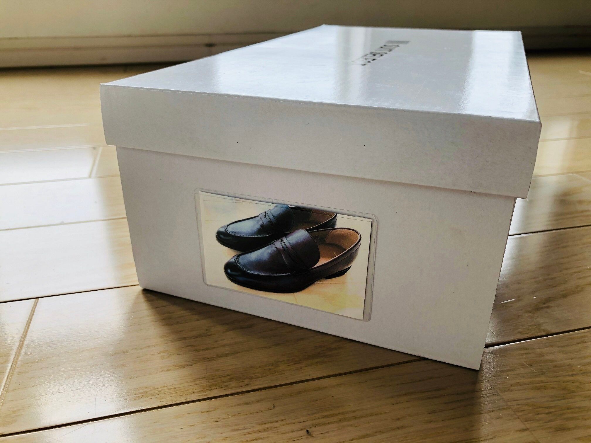 写真は、何も手を加えていない状態の箱。靴が入っている箱は丈夫で便利だから、収納時にも活躍してくれますが、中身が見えないのがネック。それを解消するためには……