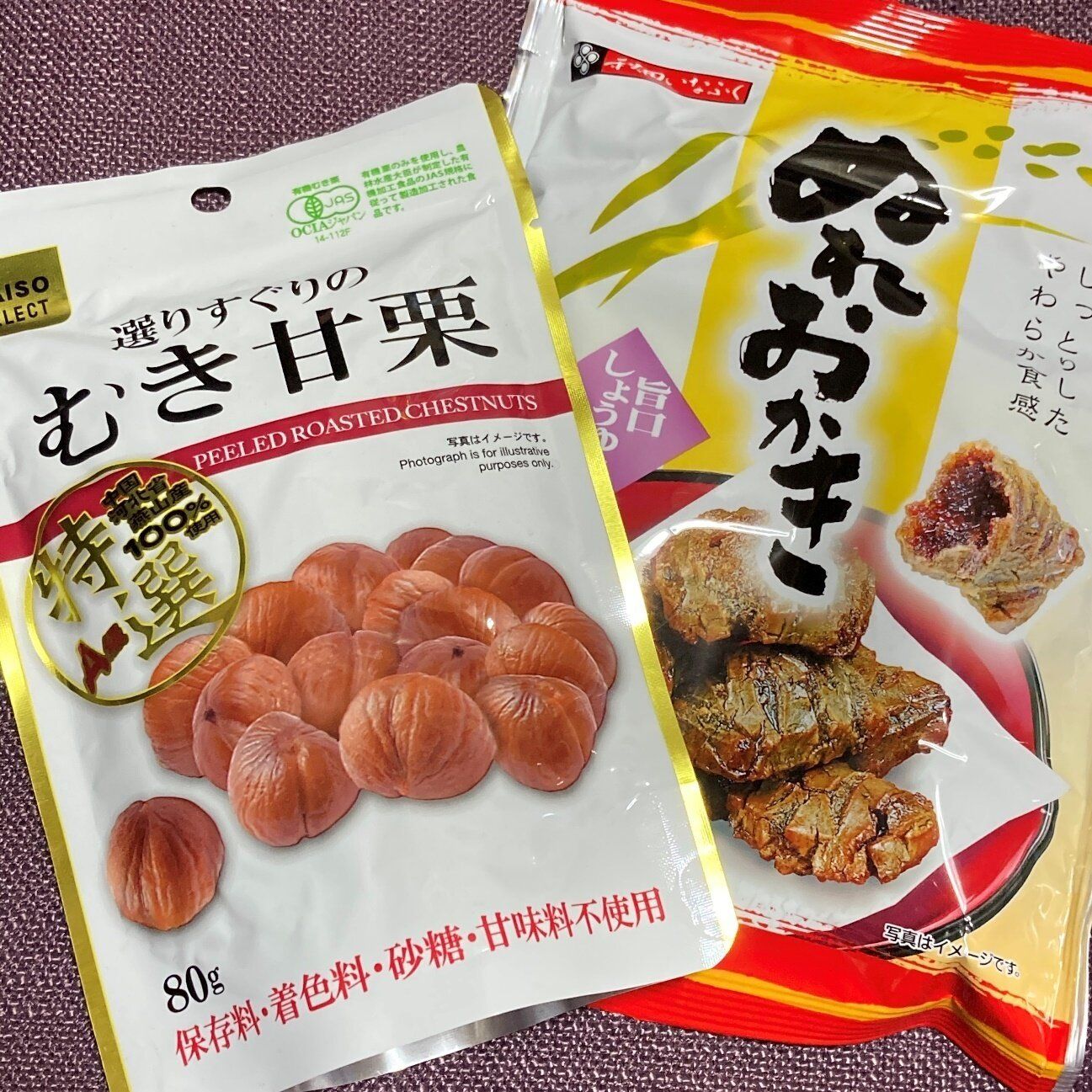 みんな大好き「むき甘栗」は、ダイソーセレクトというダイソーのプライベートブランド(PB)商品で、ダイソーでしか買えません。たっぷり80gの皮むき甘栗が入っているので、100円とは思えない満足感。もちろんとってもあまーいですよ。