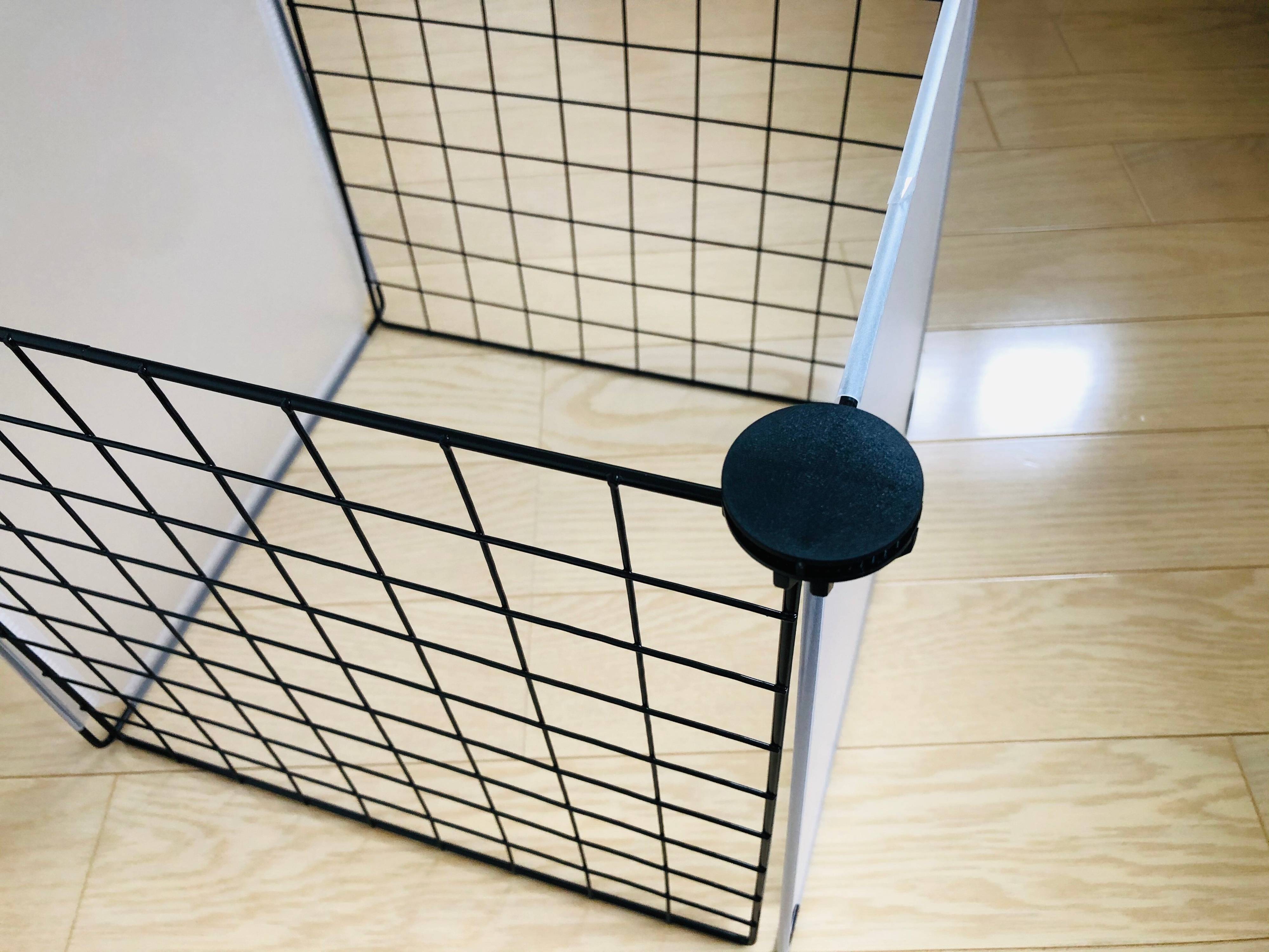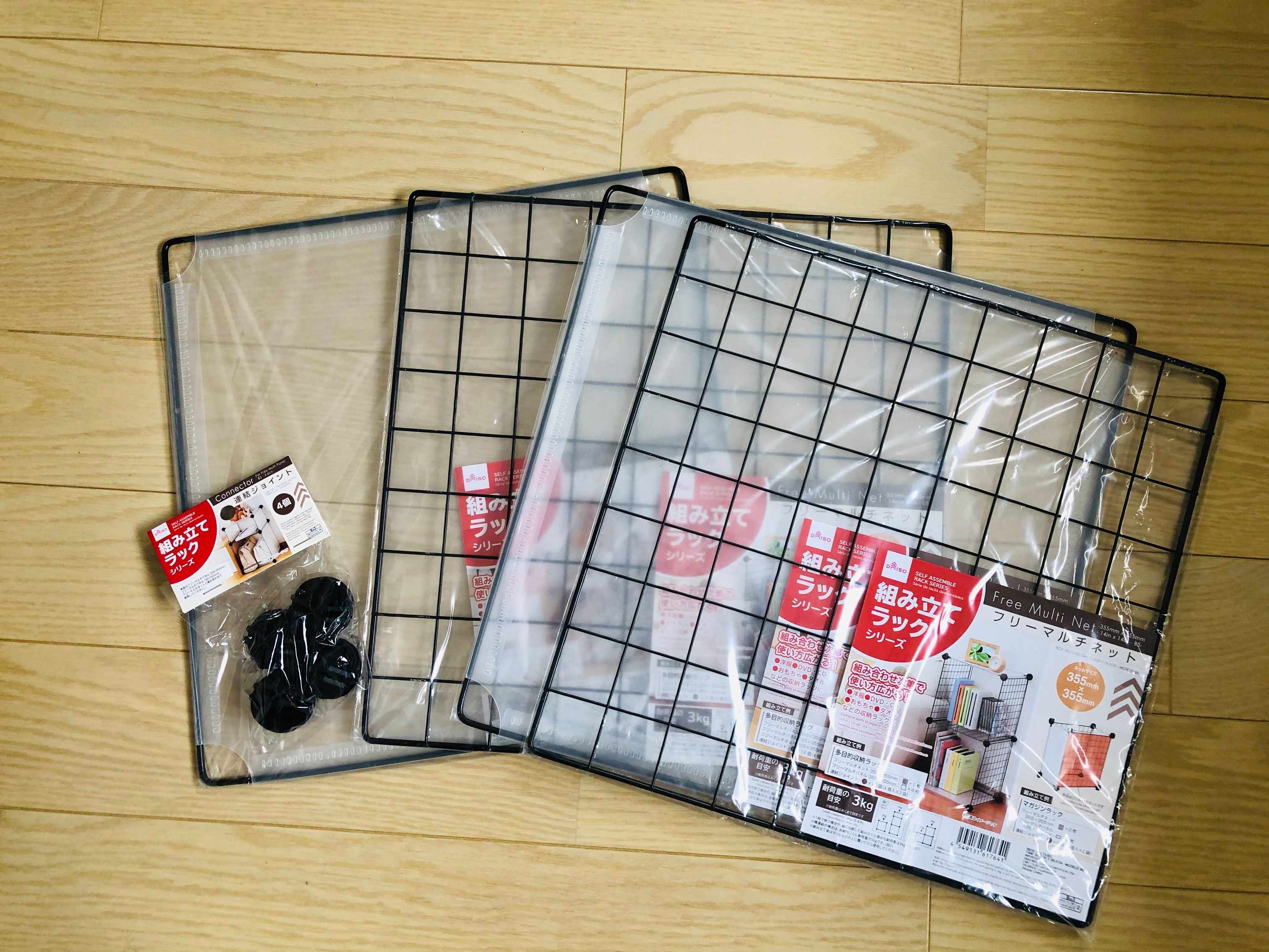 今回購入したのは、写真の商品。網目になっているパーツは「フリーマルチネット」で、サイズは355mm×355㎜。網目ではない「フリーマルチパネル」は、355㎜×355㎜と、185㎜×355㎜の2サイズがあります。これに、「連結ジョイント」(4個入)もセットで購入しました。価格はすべて、100円。