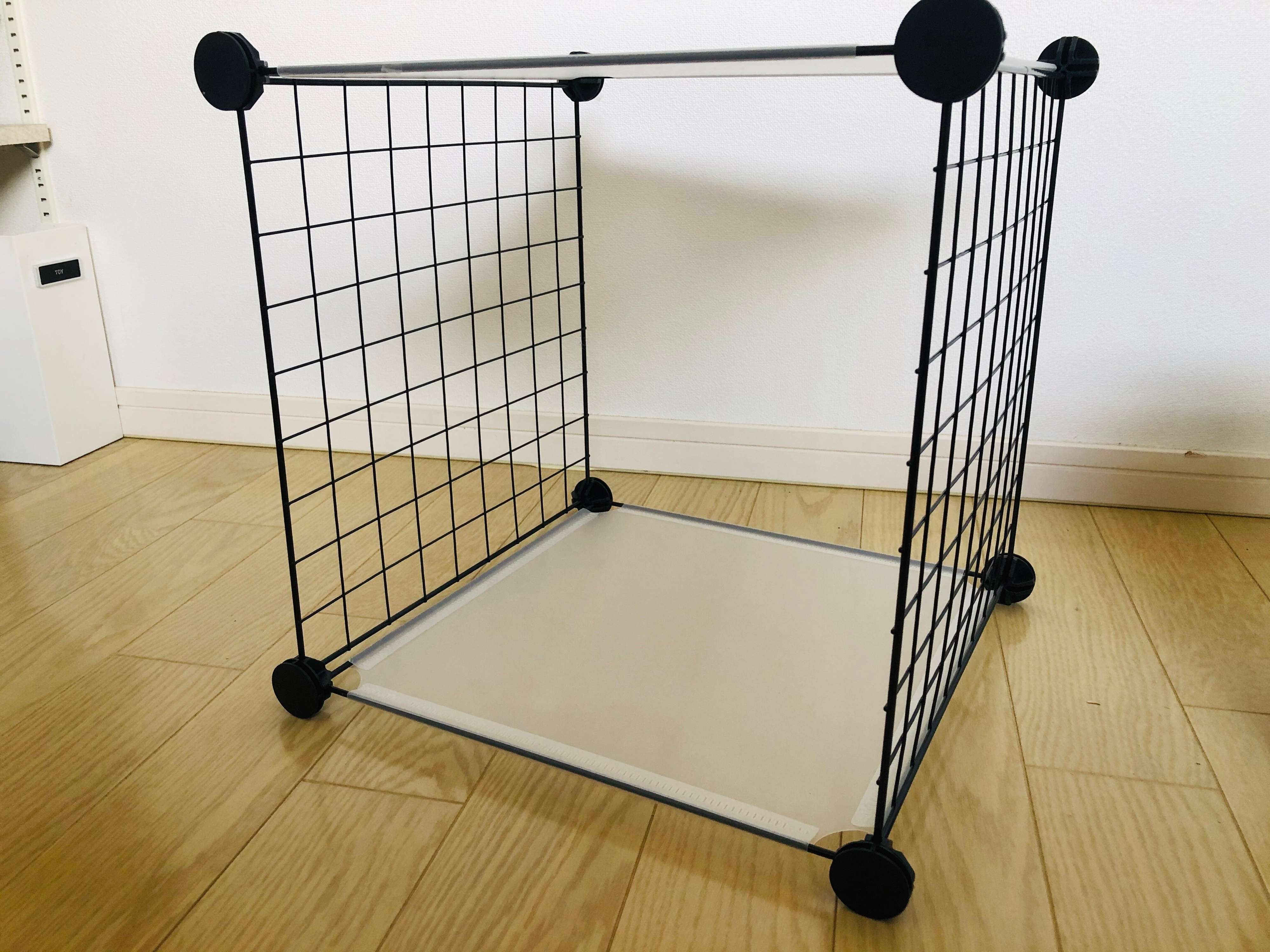 フリーマルチパネル2枚、フリーマルチネット2枚、連結ジョイント2袋で棚を作ってみました。これでたったの600円!