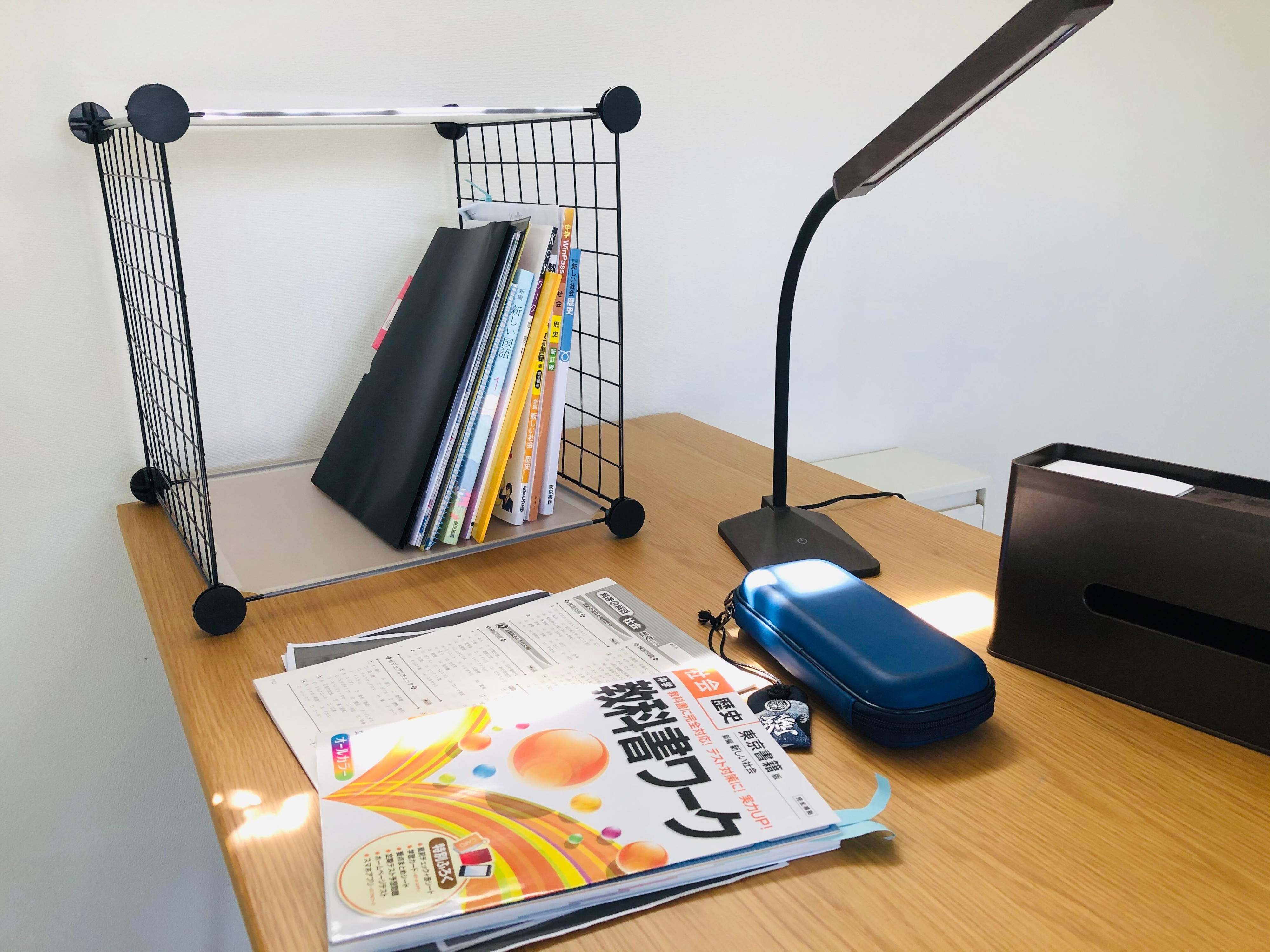 我が家では中学生の息子は試験範囲のワークをこちらに一時置き。終わったものは元の本棚に移します。見える化することで終わっているものがどのくらいかが認識しやすいし、段々減っていく様子にモチベーションを上げています。