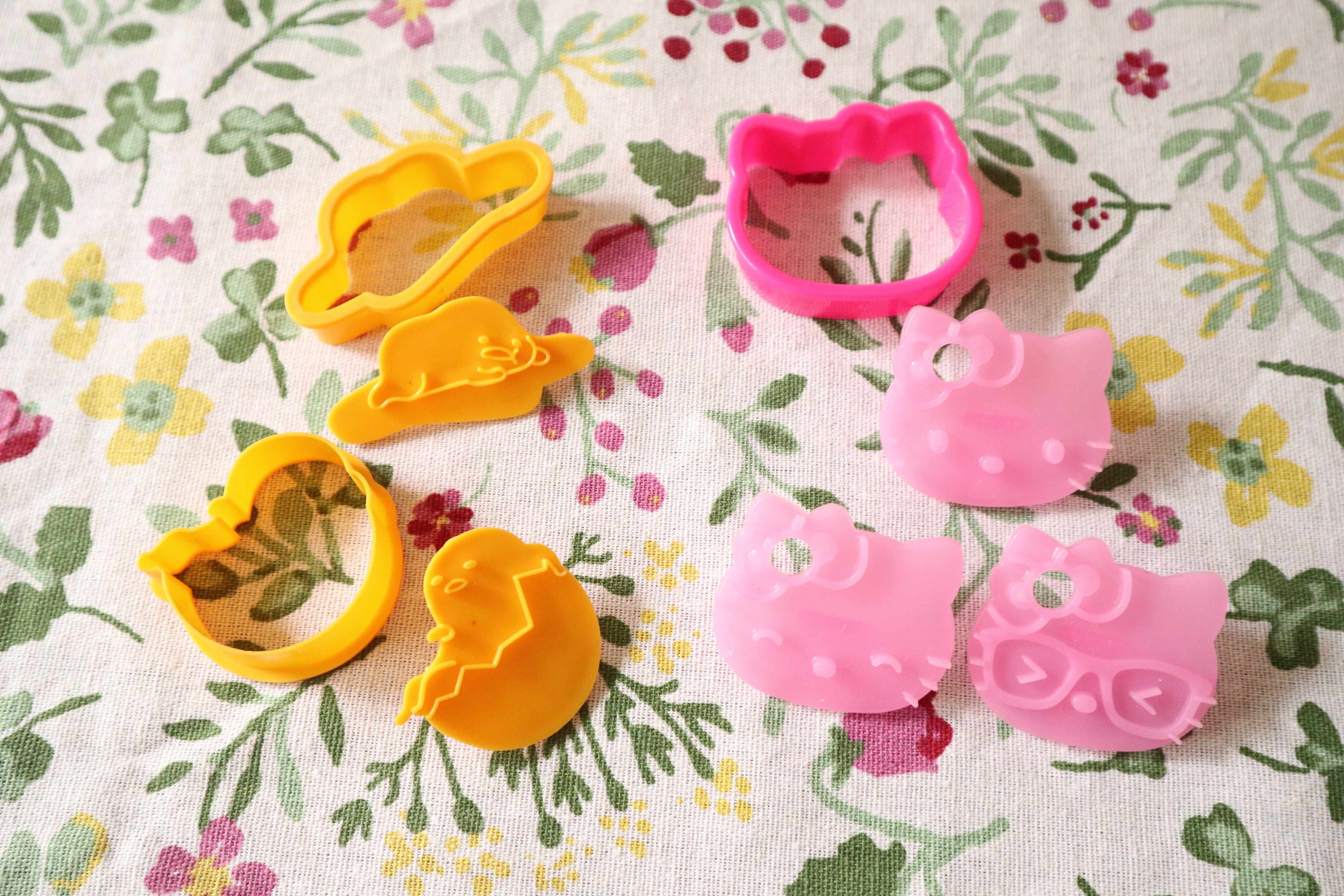 ぐでたまは2種類、ハローキティはそれぞれ違う表情で3種類入っています。スタンプつきのクッキー型になっていてとても簡単にデコクッキーがつくれます。