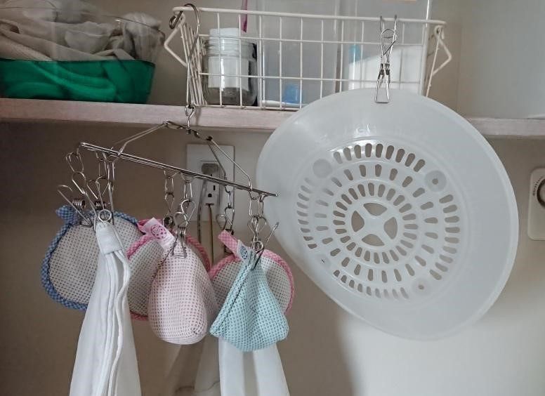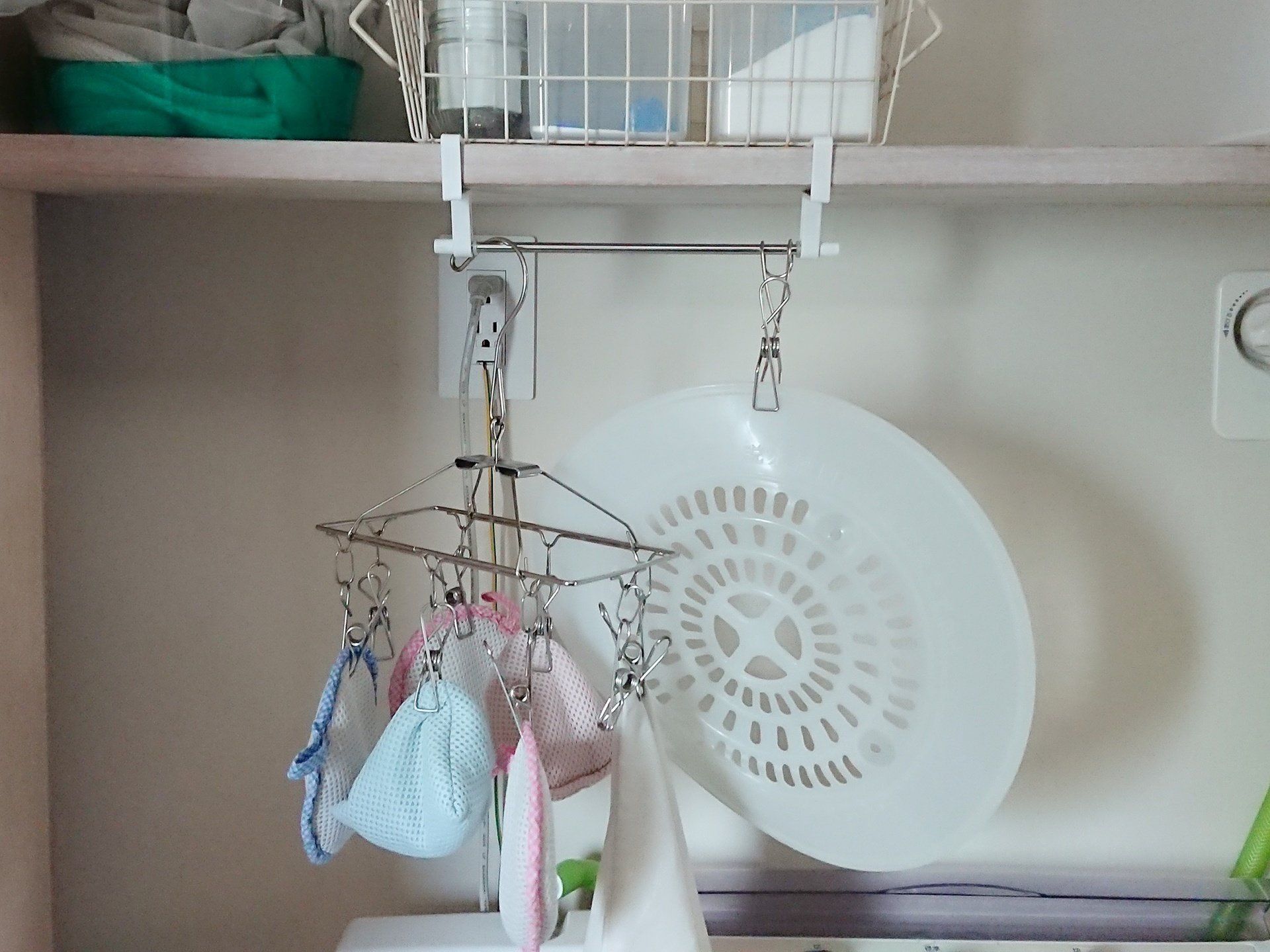 わが家の洗濯機上は写真のようにゴチャゴチャ……とくに気になるのが、洗濯につかうアイテムを吊るしているところ。洗剤を入れているカゴにひっかけているだけだったので、慌てて取るとカゴごとガシャンとかよくやっていました。