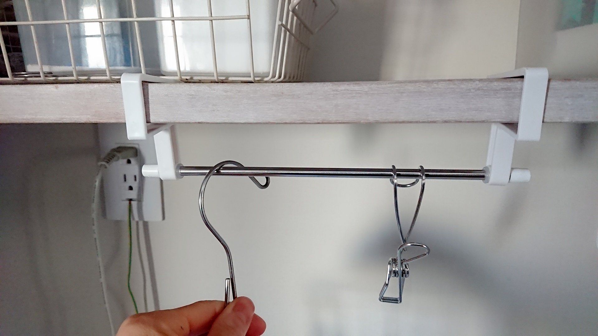 「丈夫でサビにくい ステンレスハンガーストックバー」の設置はとっても簡単。写真のように、棚板などを挟むようにすればOK。ちなみに、わが家の棚板の厚さは2cmですがまったく問題なし。まだ少し余裕があるので、3cm以内の棚板なら使用可能でしょう。