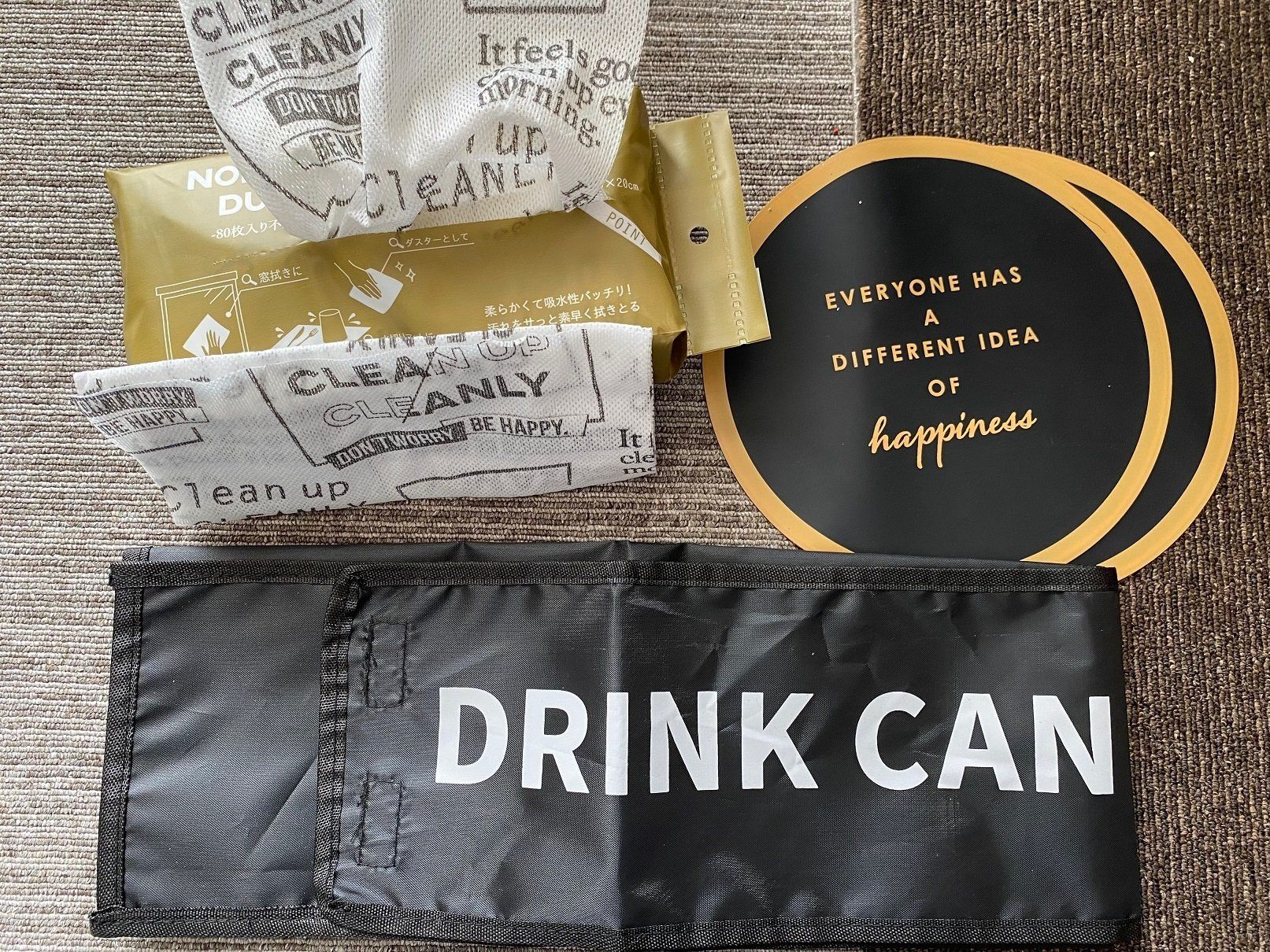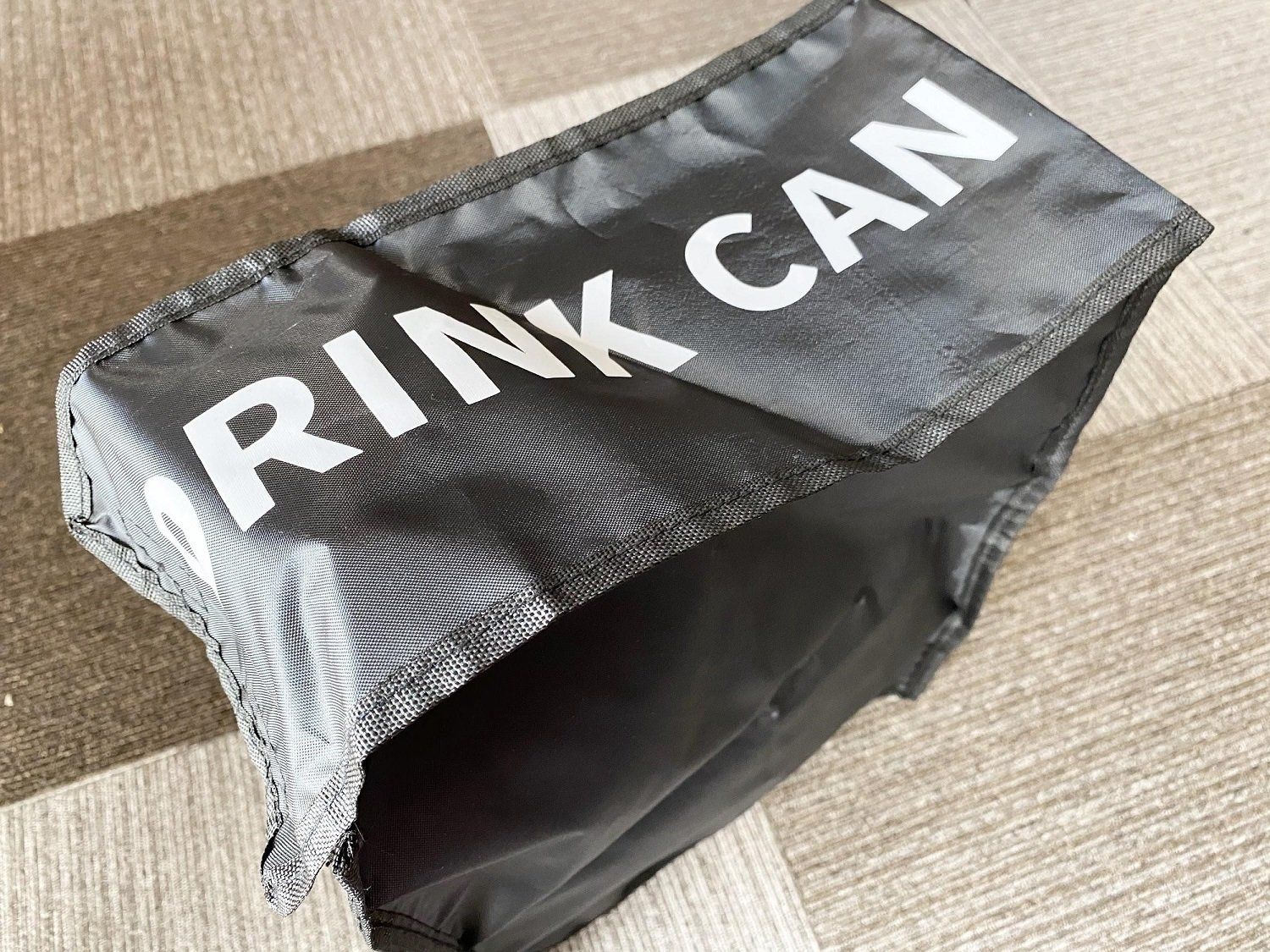 続いて紹介するのは、ドリンク缶ケースカバー。黒い布地に「DRINK CAN」という文字が書かれた、シンプルなデザイン。素材はナイロン製で、とても軽いです。