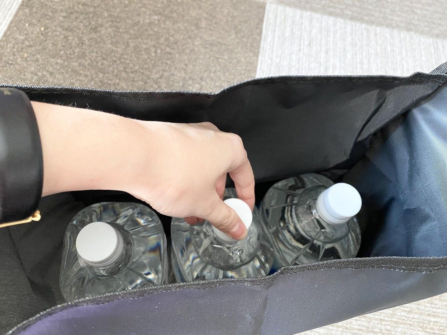 本来の使いかたは缶飲料の箱をまるごとカバーで包んで目隠しにする……というものですが、それ以外の使いみちもアリ!たとえば、2Lのペットボトルなら3本並べて入れることができます。買い置きのペットボトルを隠しておきたいときに使えますね。
