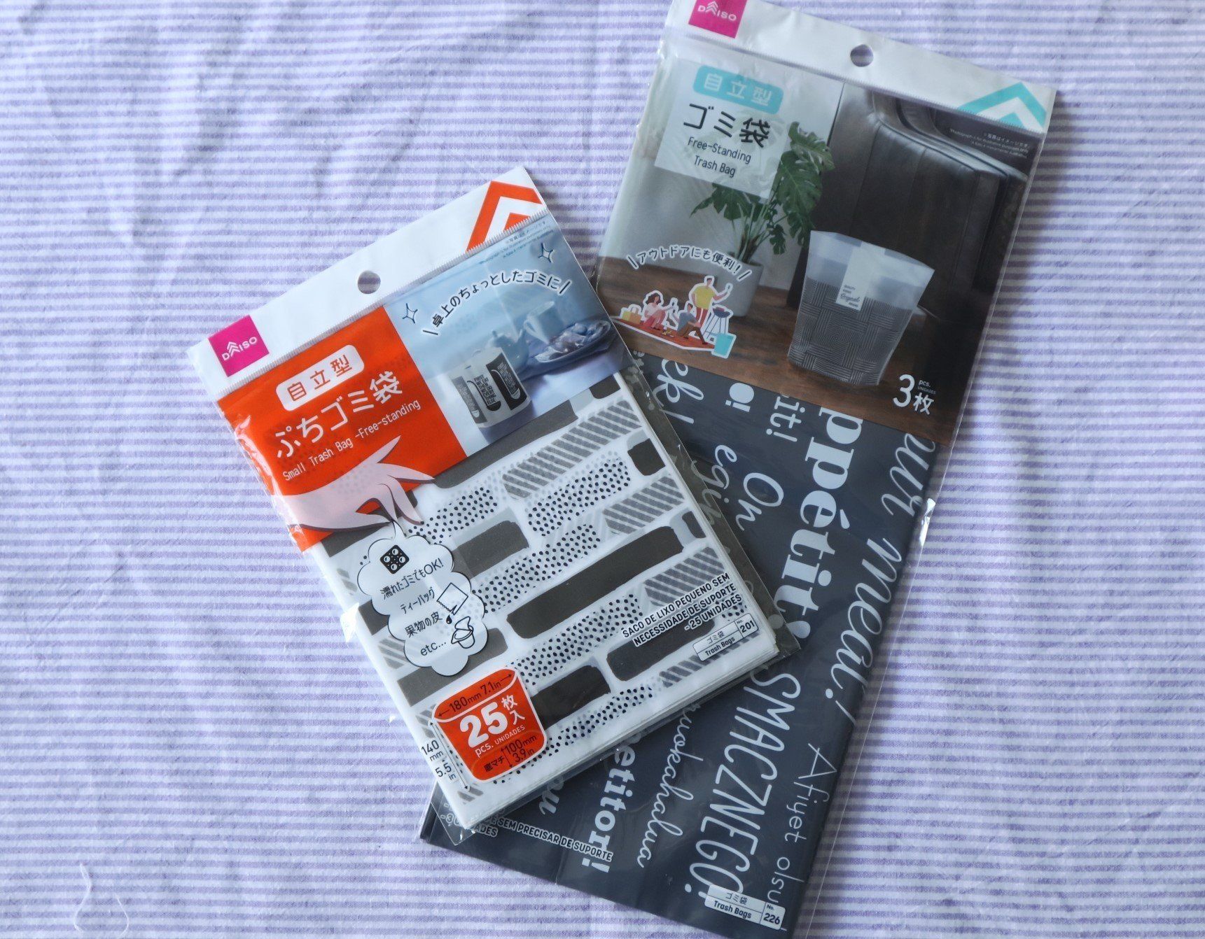 ダイソーの自立型ゴミ袋はサイズが2種類。どちらもしっかり底マチがあり自立します。プチサイズの方は、サイズ縦40ミリ×横180mmで25枚入り。大きい方は、サイズが縦300mm×横330mmで3枚入りでさらに高さがある分、折り返しがあり安定感があります。