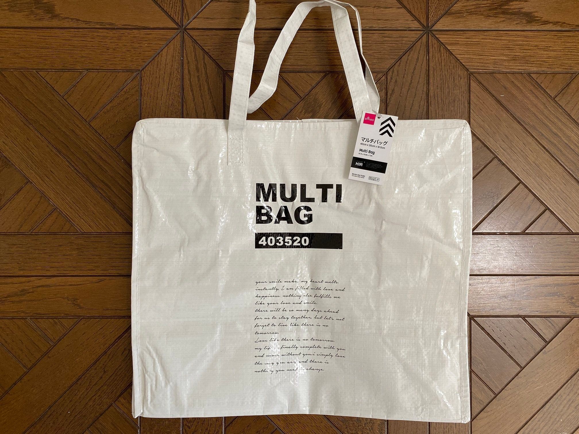 今回紹介するダイソーの「マルチバッグ」は、PP(ポリプロピレン)製のしっかりした材質と、シンプルでオシャレなデザインが魅力のアイテム。価格は100円です。