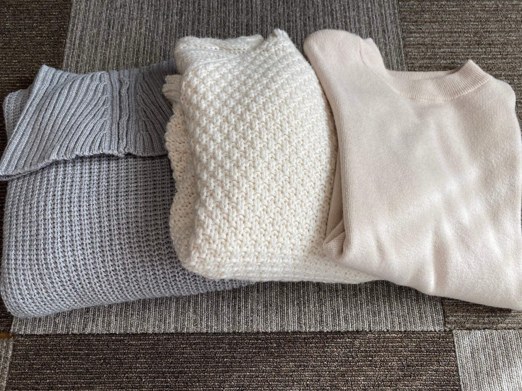 実際にどれくらいの容量が入れられるのか?今回試しに3枚のニットを収納してみましたが、写真のとおりけっこう余裕がある状態。子ども服などなら、大量に収納することができそうです。