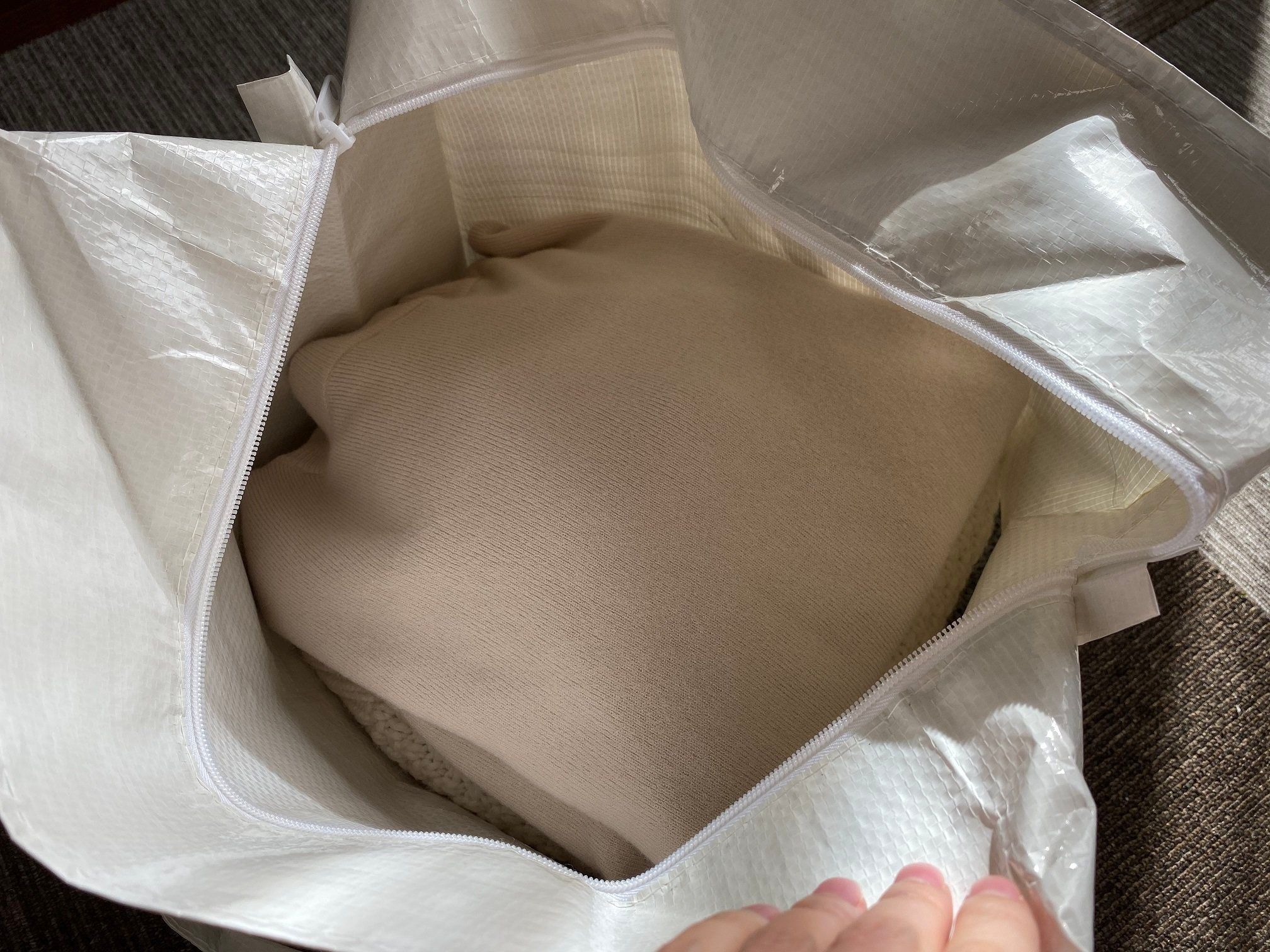 サイズは40×35×18.5cmと大き目で、さらにバッグの上部にファスナーつきなのも収納にピッタリなポイント!ストックしている際に、ホコリや汚れが着くのを防いでくれます。