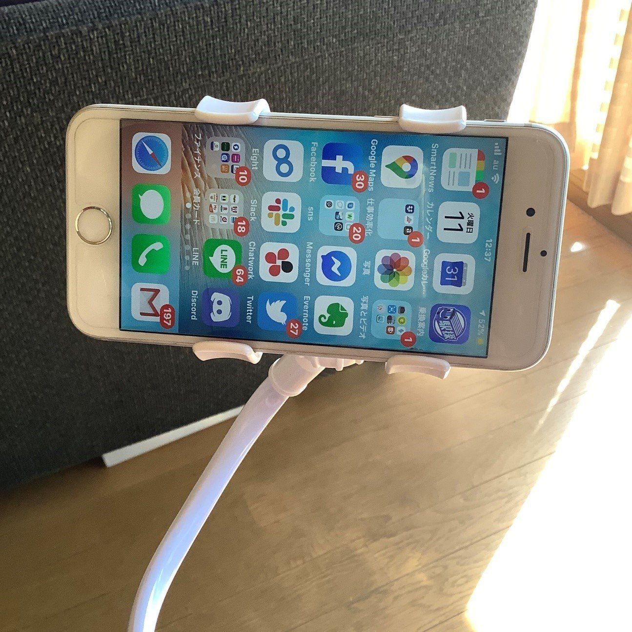 マッサージ椅子に座って、のんびりしながら動画を見るのが夢でした。しかし、手にスマホを持っていると、マッサージ機の振動で、映像がまともに見れないのです。そこで、椅子のひじ掛けに「スマートフォンスタンド」を装着してみることに。