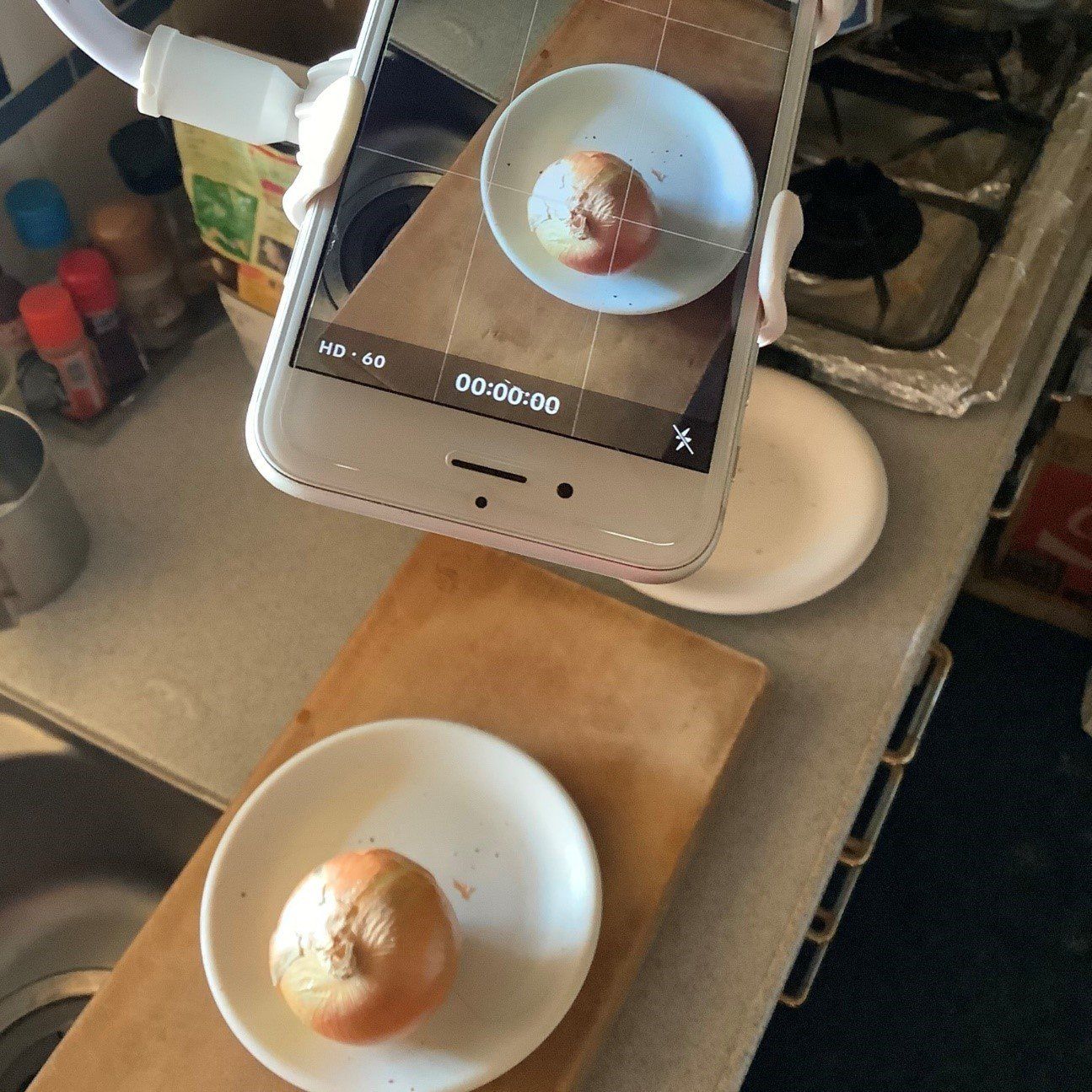 キッチン上の棚に挟めば、料理しているところをスマホで簡単に撮影できます。両手が使えるし、撮影シーンも上から眺めることができて、とっても便利。