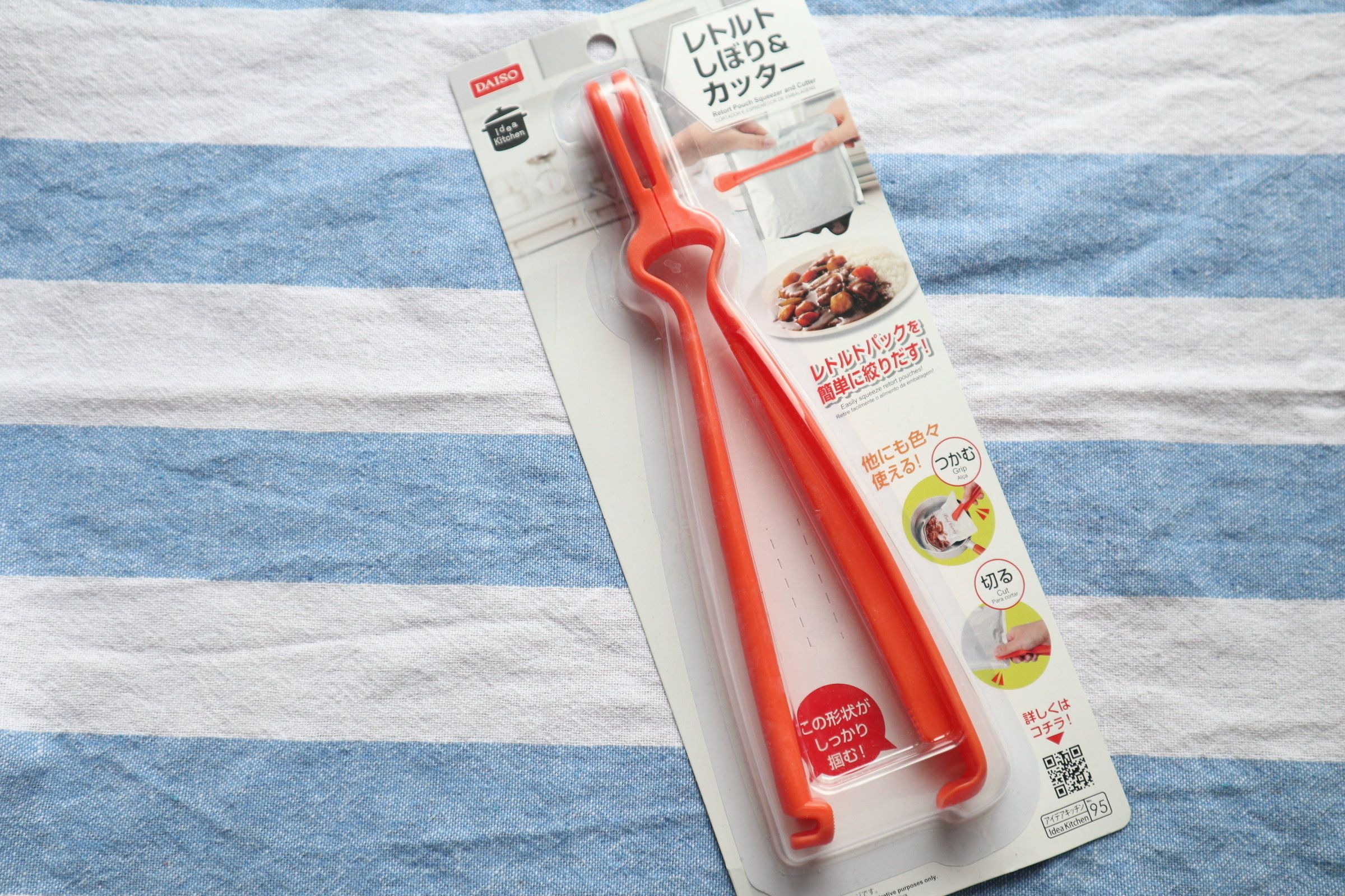 ダイソーのレトルトしぼり&カッター100円。しぼる、つかむ、切るということがこれ1本でできます。収納は限られているので、マルチウェイなキッチングッズはものが増えなくていいですよね。