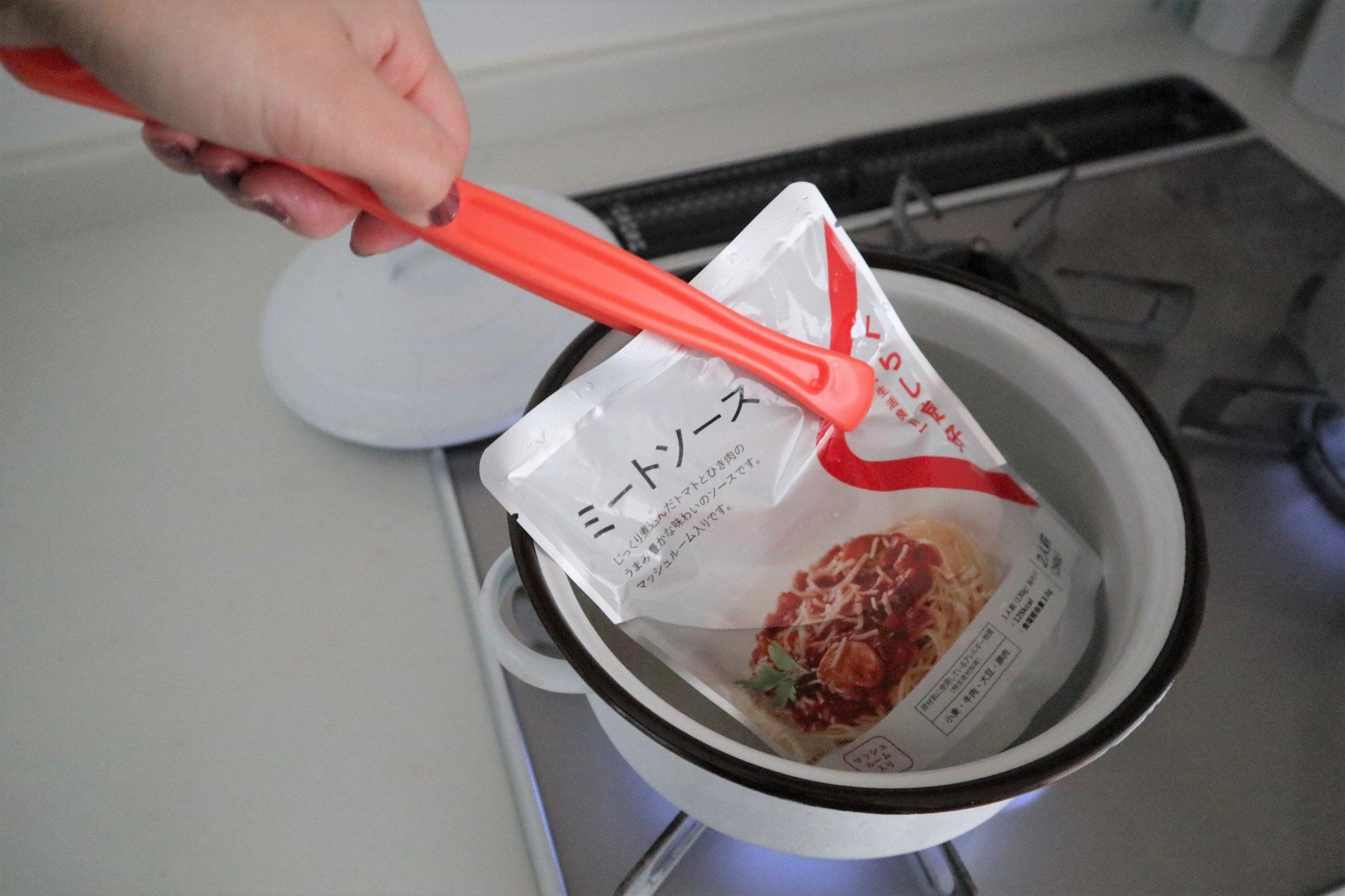 湯せんしたレトルトパウチを、鍋から取り出すときに使えます。しっかりつかめる形状になっているのではさみやすく、滑り落ちないので安心。