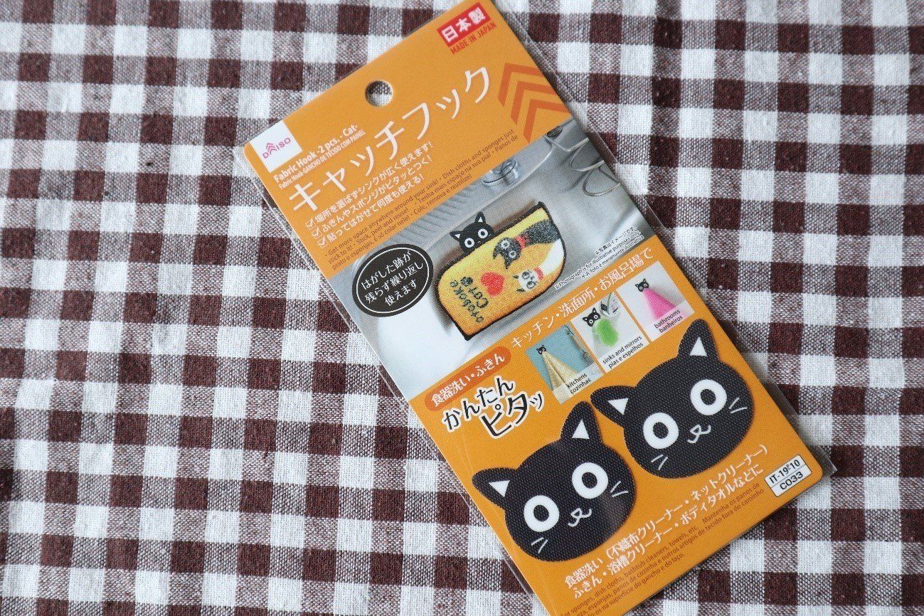 ダイソーのキャッチフック2個100円。黒ネコのモチーフがかわいいです。フックといっても突起物などはついていないただのシールに見えますよね。