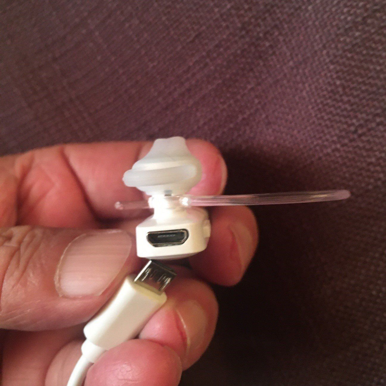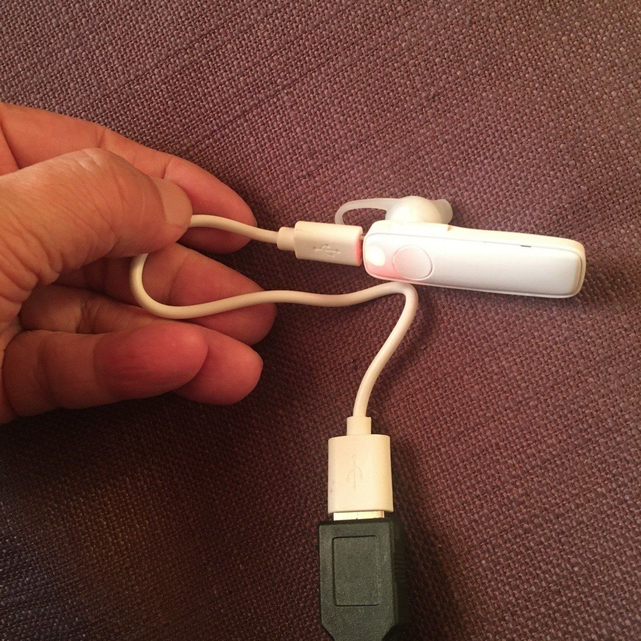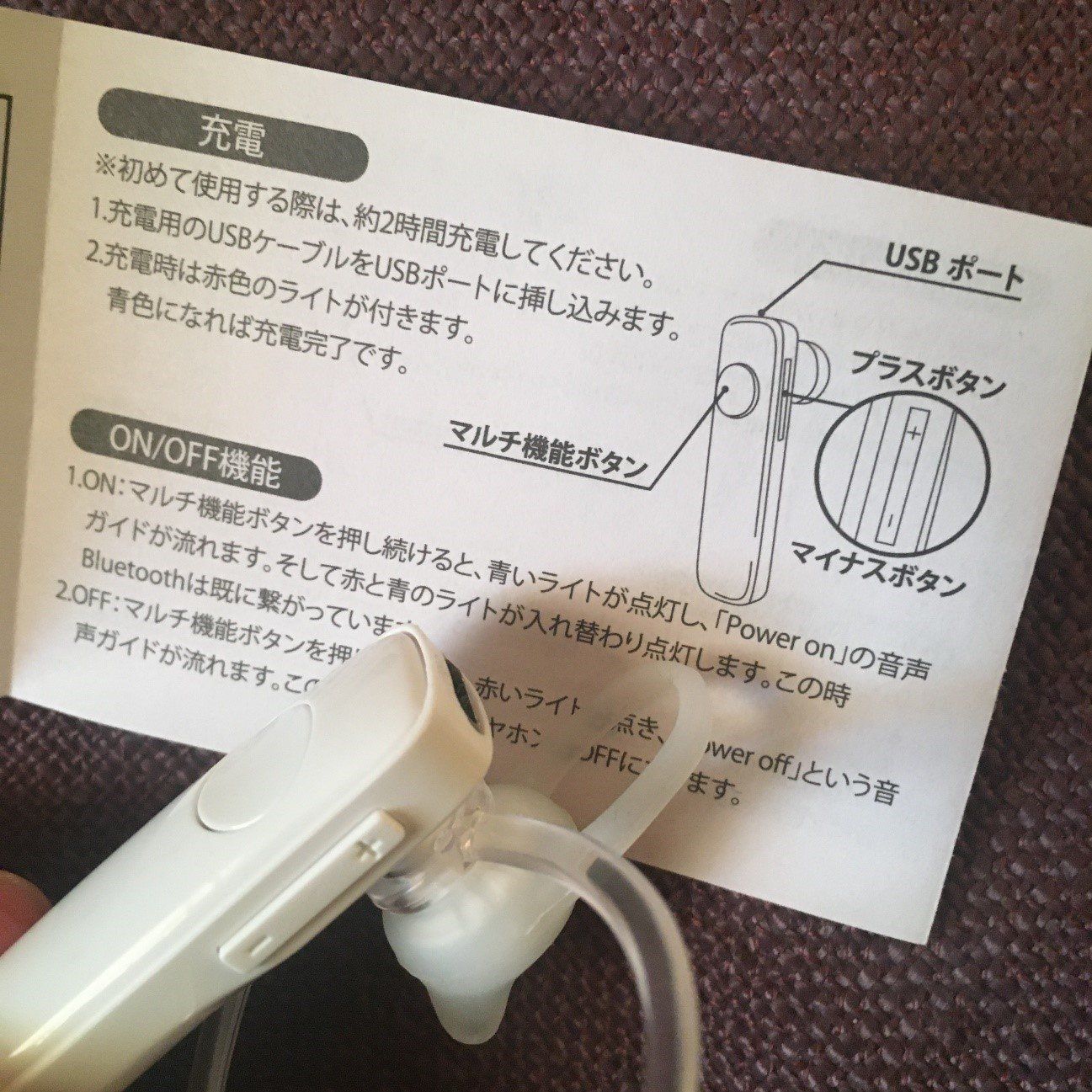充電にはUSB充電器が必要です。イヤホンの上部にある充電口に接続して充電します。本体の、赤いライトが青く変わると充電完了。