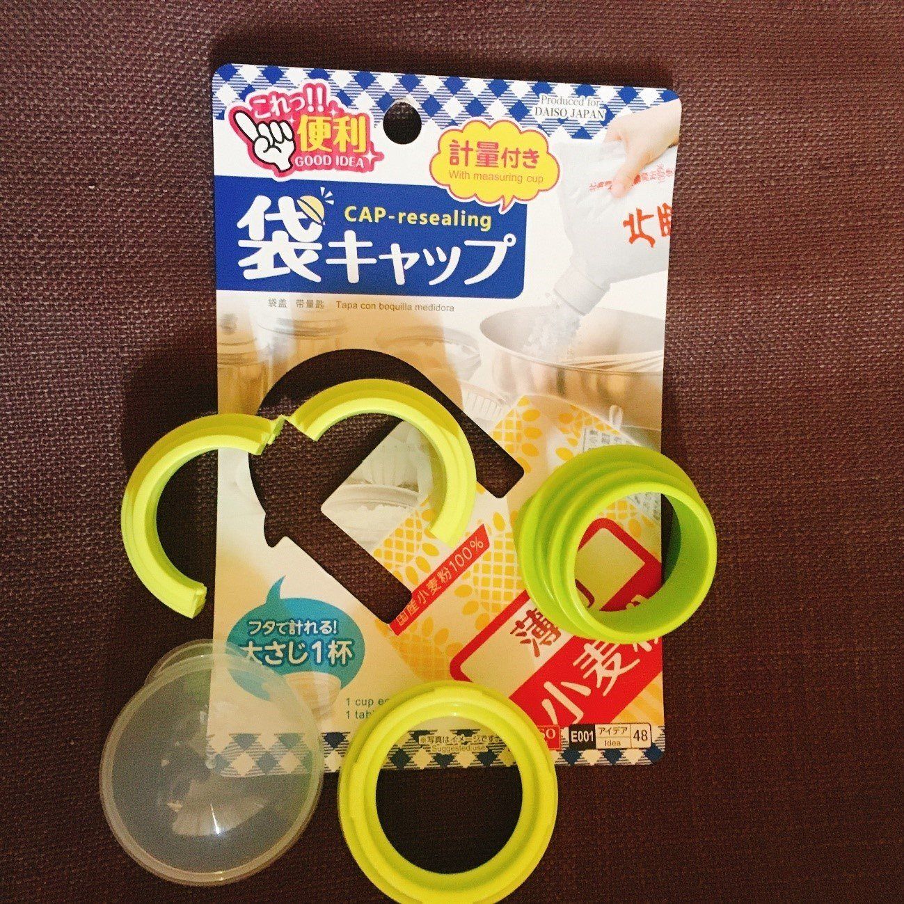 ダイソーの「袋キャップ」は、小麦粉・片栗粉・砂糖・塩などの、袋に入った調味料をそのままキャップ付きにする商品です。