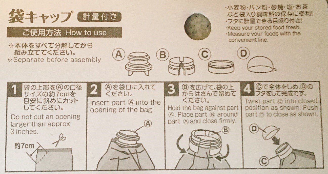 袋キャップをパッケージから取り出して分解すると、写真のように4つの部品に分かれます。なんだかちょっと面倒な感じもしますが、パッケージの裏面に書かれている説明に沿って組み立ててみましょう。