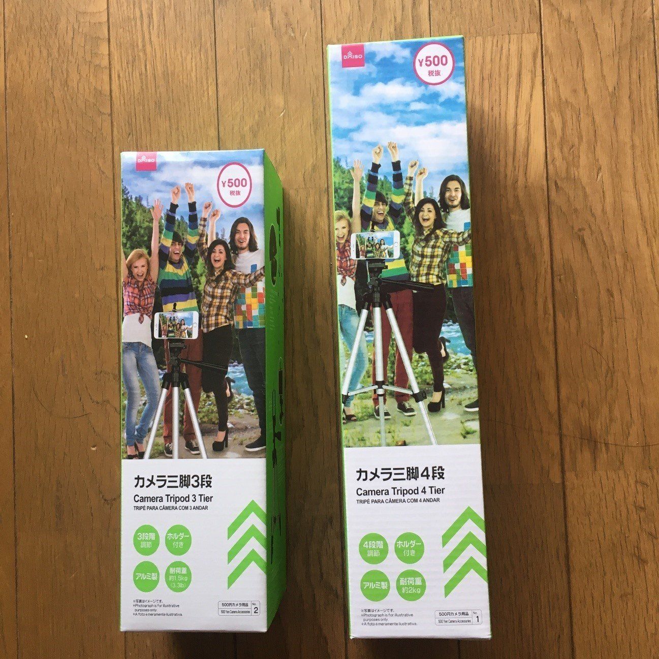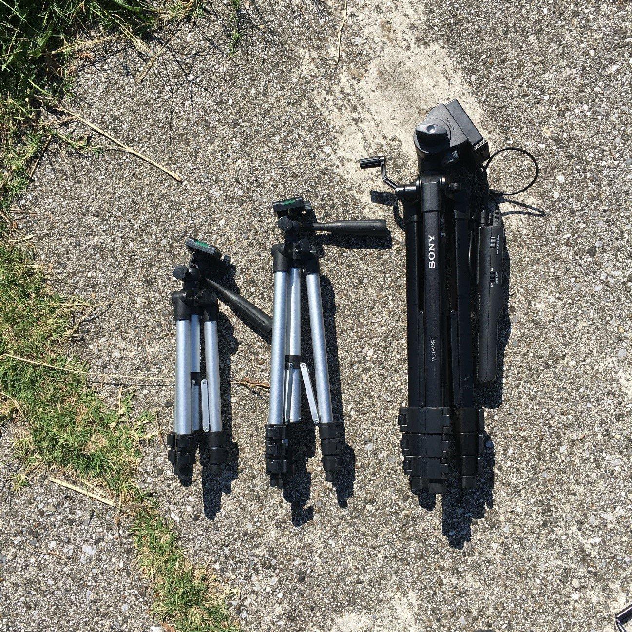 ダイソーのカメラ用三脚は3段と4段があります。写真左が3段、中央が4段で、右は一般的に使われているプロ用の三脚です。並べてみるとサイズの違いがよくわかりますよね。