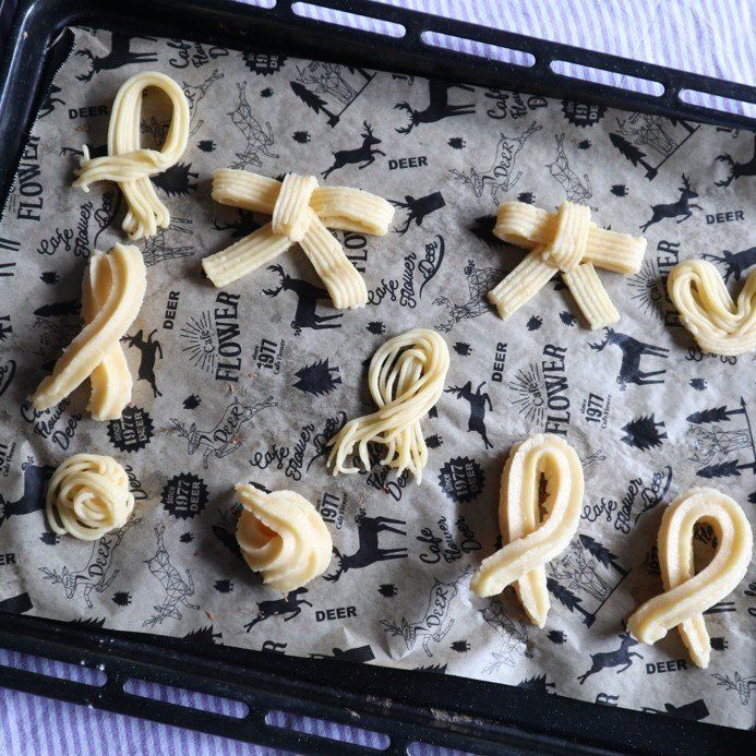 絞りだした生地を冷やすのがポイント。生地が固まり成型しやすくなるので、きれいにつくることができます。