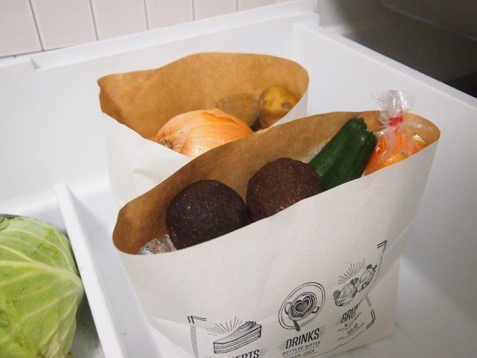 キッチンでも活躍してくれる紙製ストッカー。冷蔵庫の仕分けにも使えます。お菓子などの買い置き食品の保管や収納にも使えます。大きいサイズのほうはワインボトルが3本入りました。