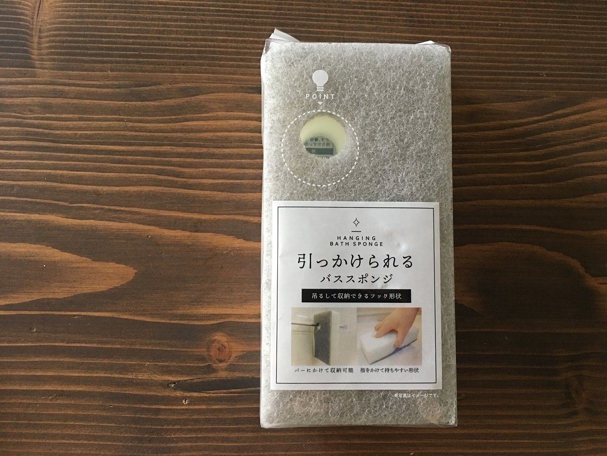 セリアの「引っかけられるバススポンジ 」(100円)。サイズは16×8cmで、厚みが4cmあります。本体のグレー部分は粗めの素材で、白い部分は柔らかなスポンジになっています。