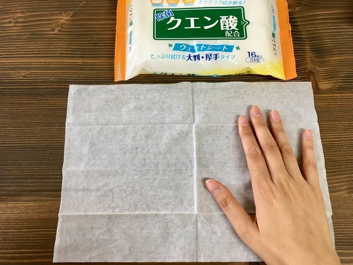 黄色パッケージが目印のクエン酸入りシートは大判・厚手タイプ。手と比較するとわかりますが使うときは半分折りする感じですね。クエン酸は酸性なので、水垢や石鹸汚れなどのアルカリ性の汚れを落とします。お風呂場や洗面所など水まわりの掃除に向いています。