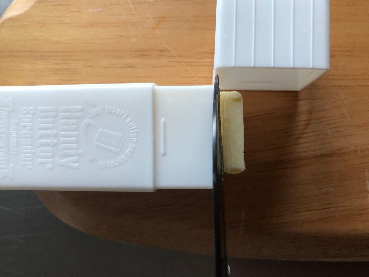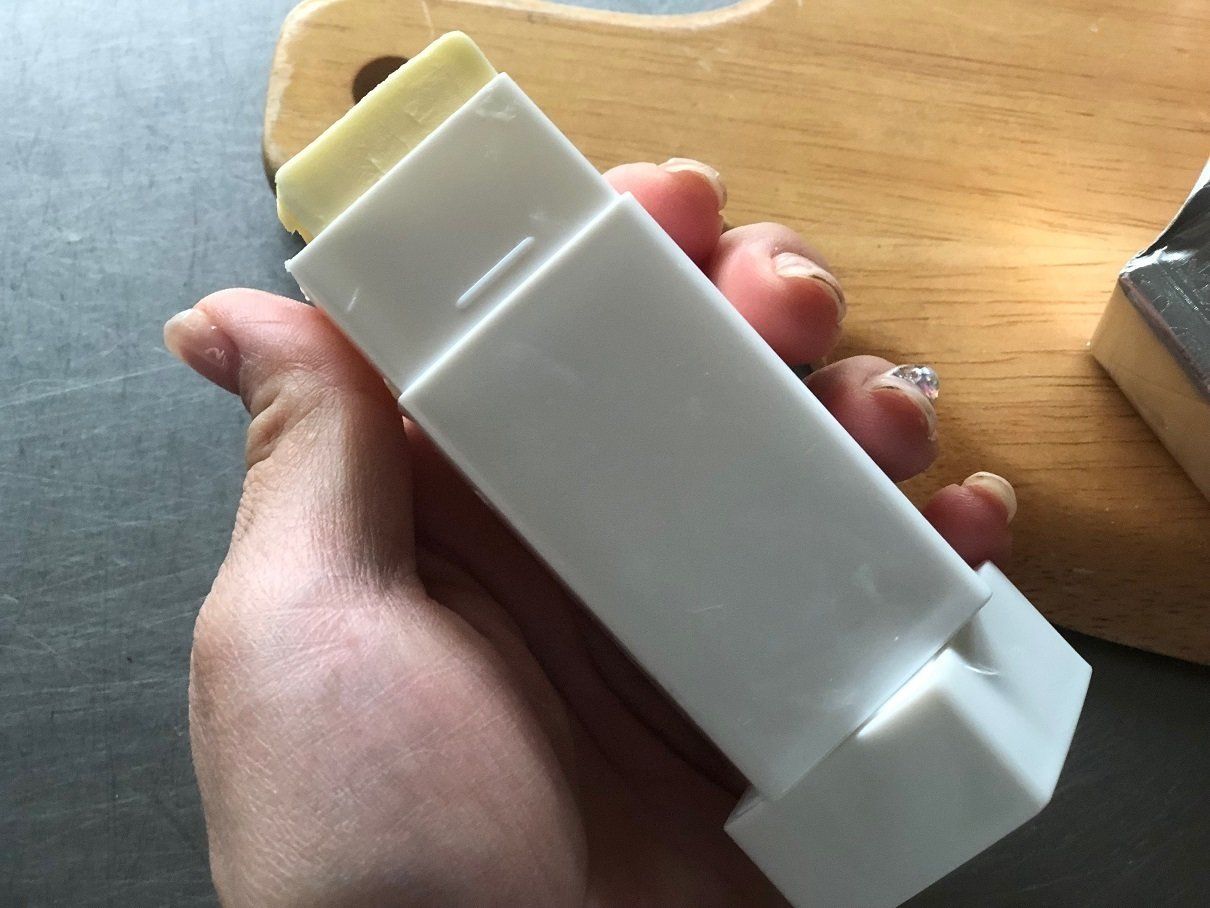 スティックのふたには、約5g分カットできるガイドラインつき。これに合わせてバターを押し出してもいいですし、カットするのもOK。細かいながらもとても便利ですね!