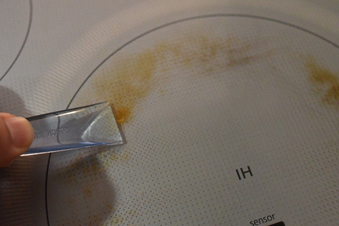 乾いて固まった汚れに鋭角に当ててこすると、汚れがそぎ取られるように落ちました。しかも樹脂製の「スクレーパー」なので、傷つきもありません。