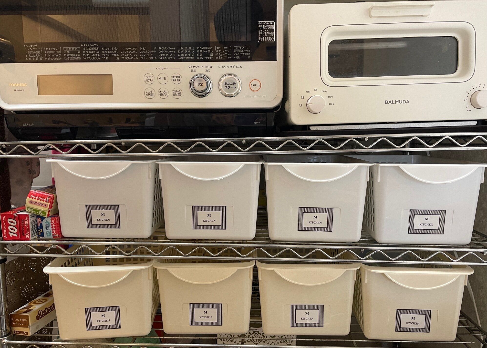 オープン棚に並べてラベルを貼れば、スッキリと統一感が出て100均ぽさは皆無ですよ。