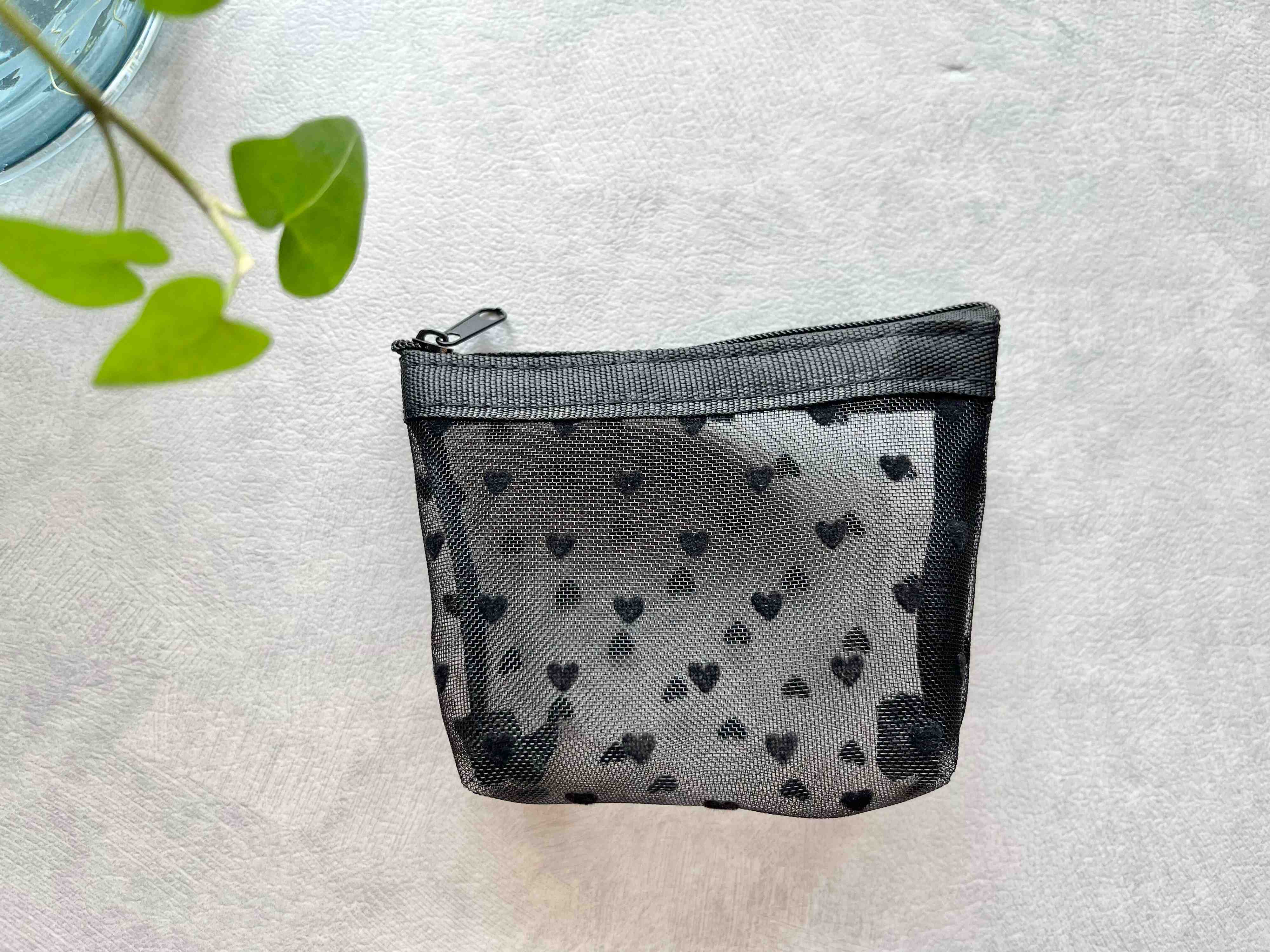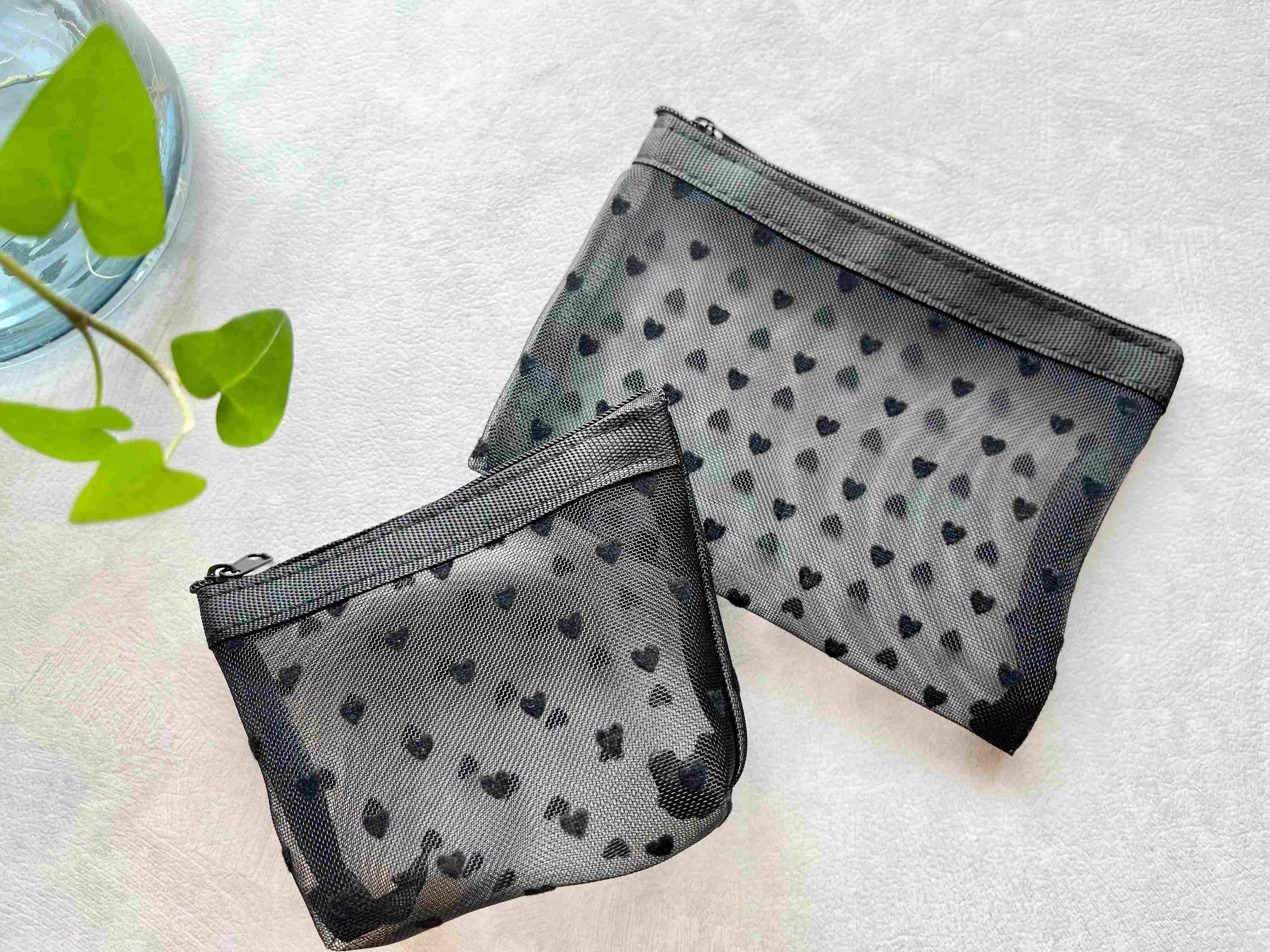 ご紹介するのは、セリアの「シアーハートポーチ」(110円)。デザインはフラットタイプとマチ付きタイプの2種類があり、どちらも透け感のあるシアー素材の生地に、ベロア風生地のミニサイズのハートがたくさんあしらわれています。ハート柄ですが黒ベースのデザインなので可愛くなり過ぎず、大人可愛いといった印象。