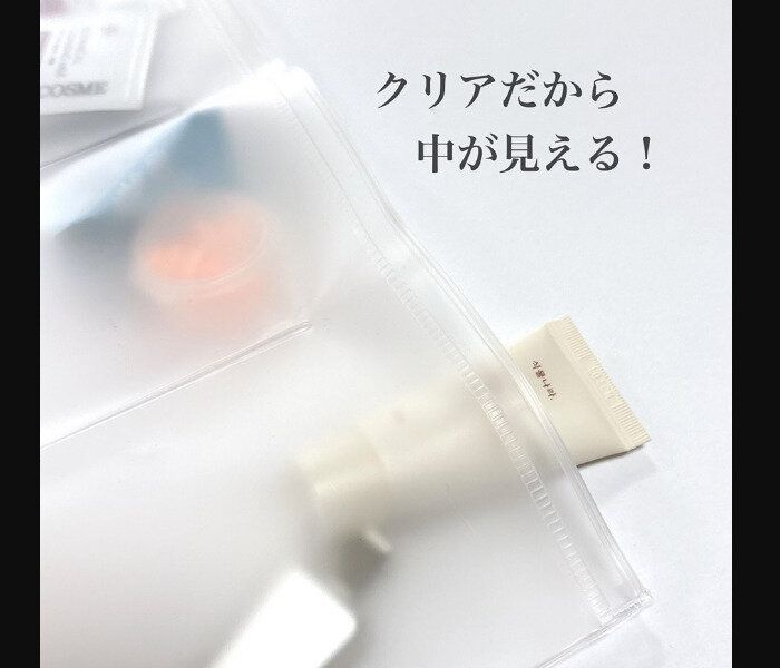 半透明の素材のため、なかに何が入っているかも一目瞭然。さらにポーチをまとめる際のゴム紐は、フックなどに吊り下げられ、省スペースになるのが◎。旅行だけでなく、日用品の仕分けや温泉やジムなどに洗面用具を持っていくときにも大活躍。110円なのが信じられない機能的なポーチです。