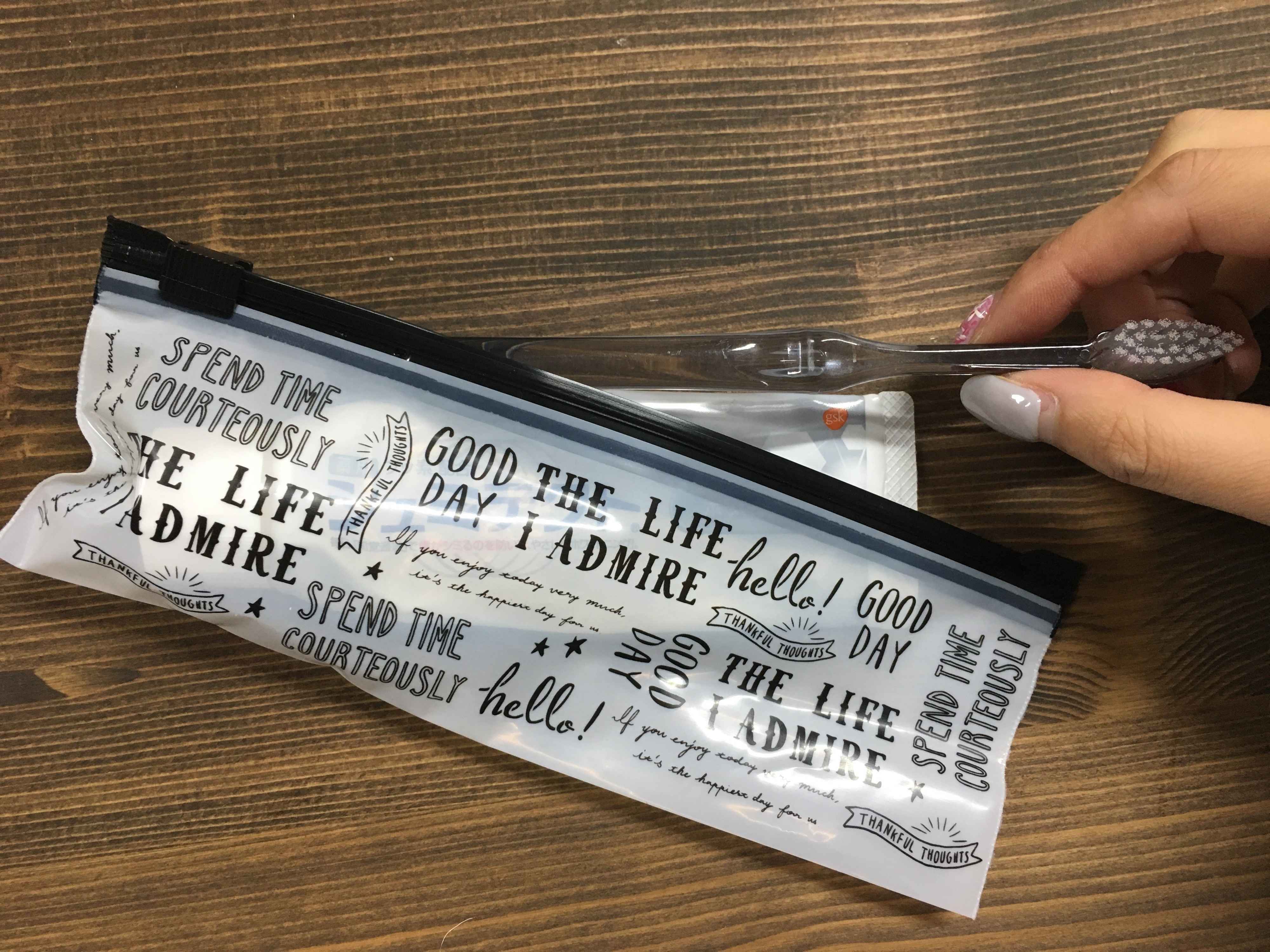 セリアのスライダー付きエチケットケースは、100円(税別)で6枚入り。私が1番入れたかった、歯ブラシセットがピッタリと入ります!マチはありませんが、意外と入ります。また、袋がスライド式なので入れた物をラクラク出し入れすることができます。