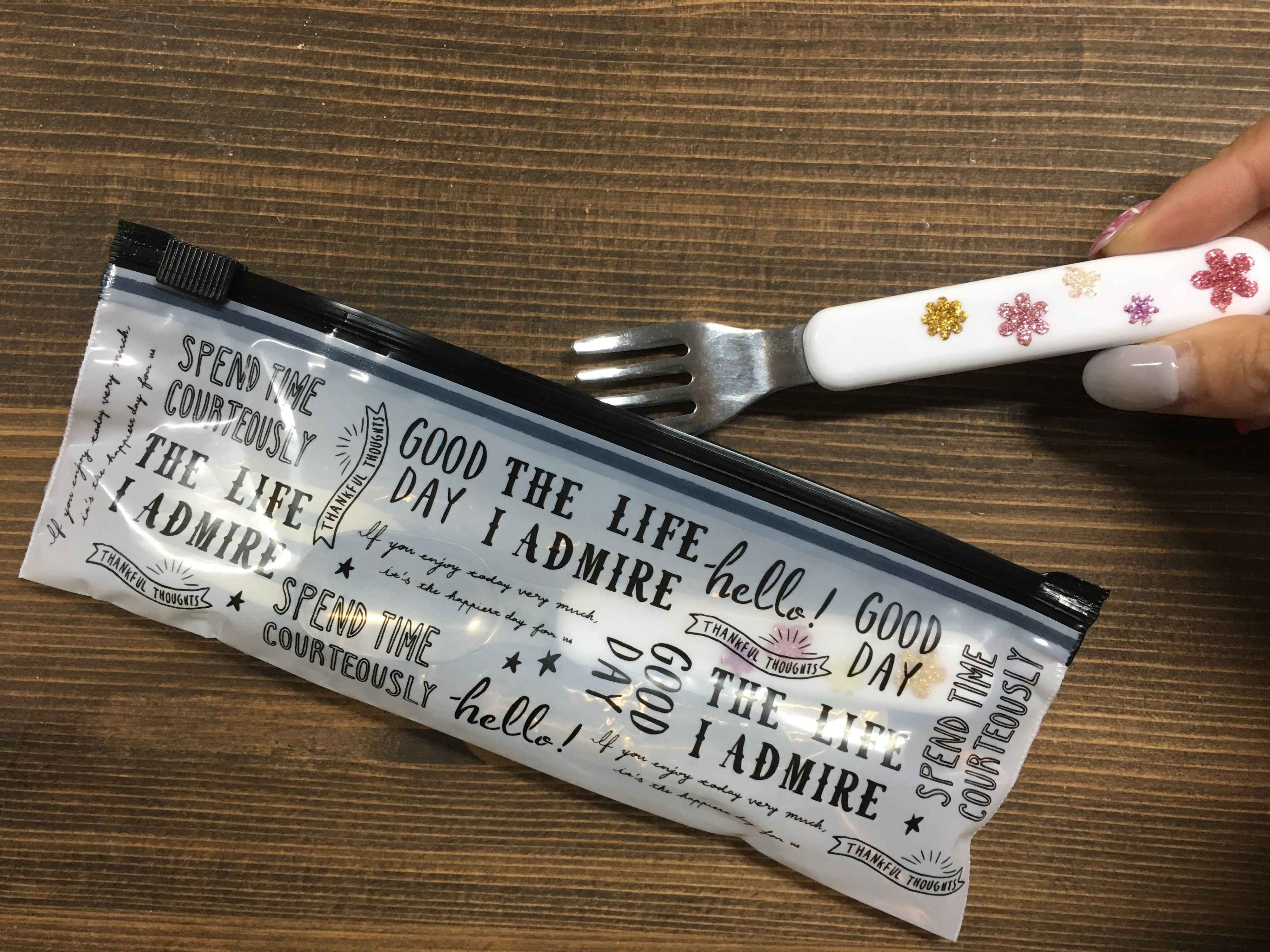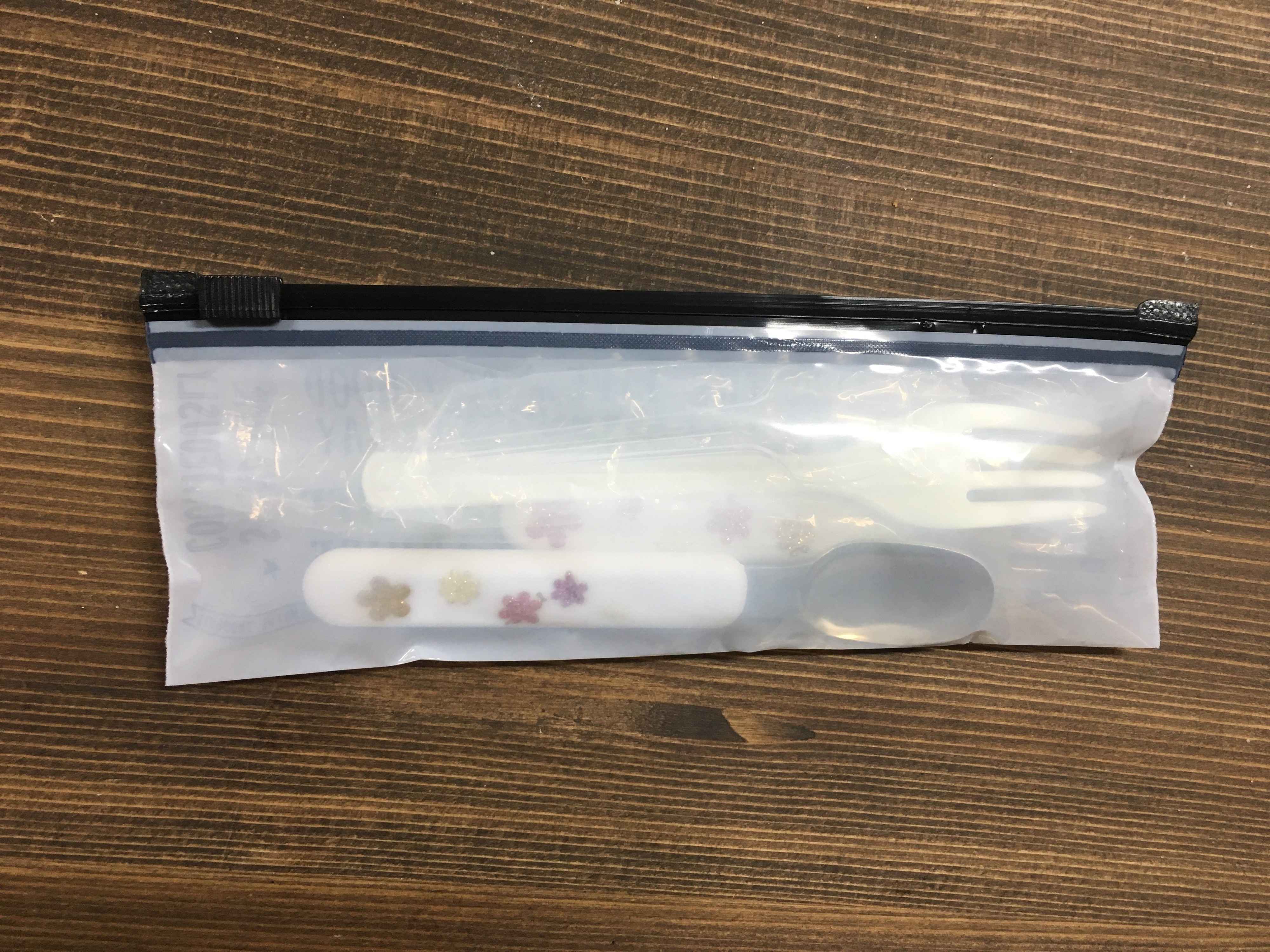 子ども用のカトラリーセットも写真のとおりスッキリ収納!外出先でちょっと食べさせたいときや、お弁当の時にこのスライダー付き袋でひとまとめにすると便利ですよね。