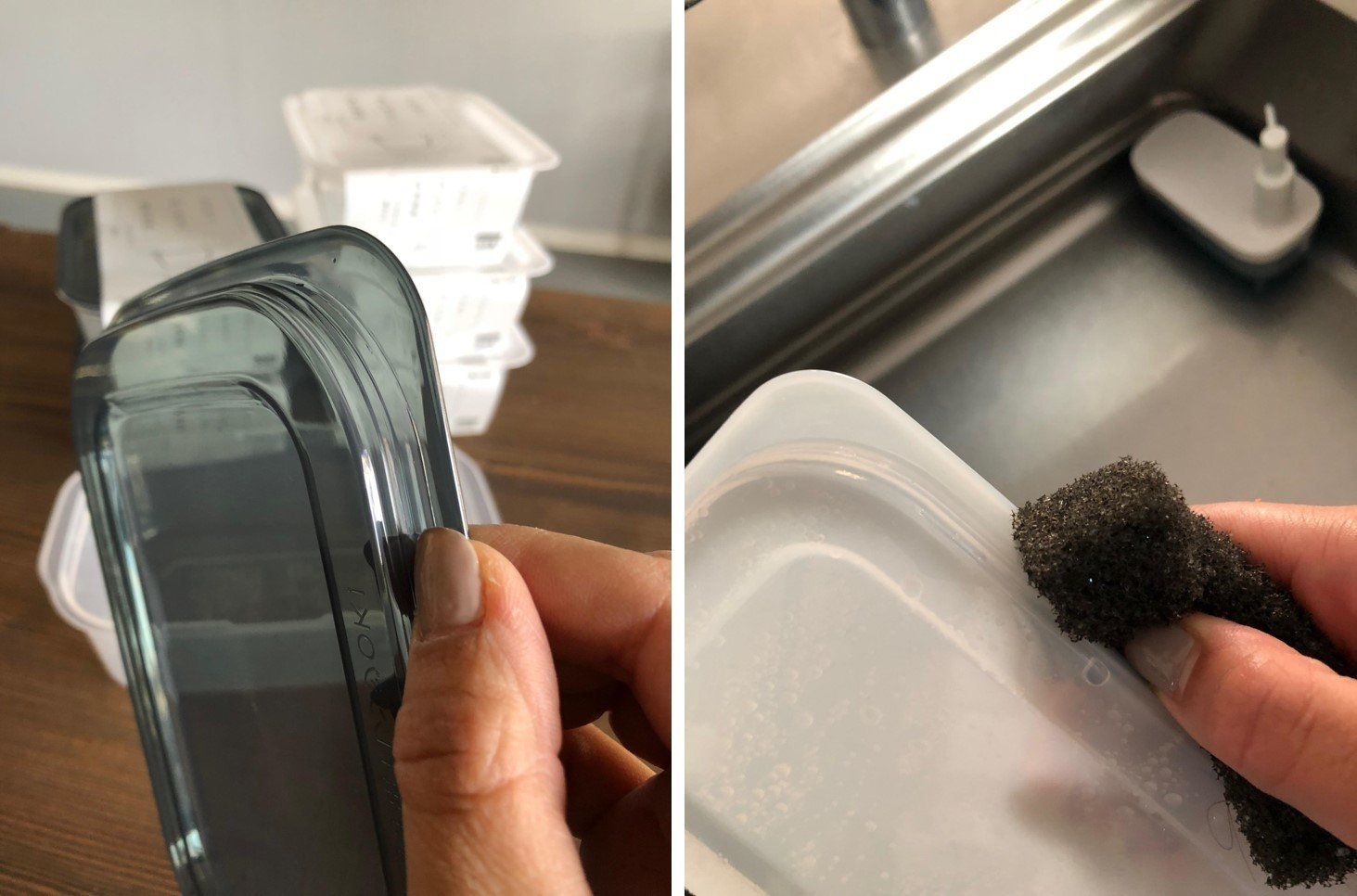 セリアの「とにかく洗いやすい 保存容器」(価格100円・税別)。洗いやすい秘密は、フタにありました。写真のとおり、フタのふち部分にミゾがありません。そのおかげでミゾに汚れが詰まるなんてこともなく、スポンジもしっかり密着するのでとても洗いやすいのです。