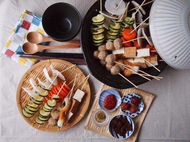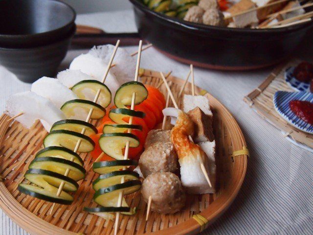 大根や人参、ズッキーニなどの野菜を“らせんカット”したら串にさします。そのほかの具材も串に刺したら、フォトジェニックな“串鍋”が完成!!おしゃれな見た目だけではなくフィンガーフードで食べやすいです。