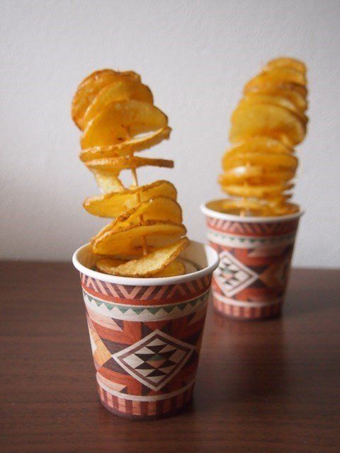 じゃがいもをらせんカットして、串にさして揚げて塩をふったらトルネードポテトの完成。屋台の味がおうちで楽しめます。子供からも喜ばれること間違いなし。