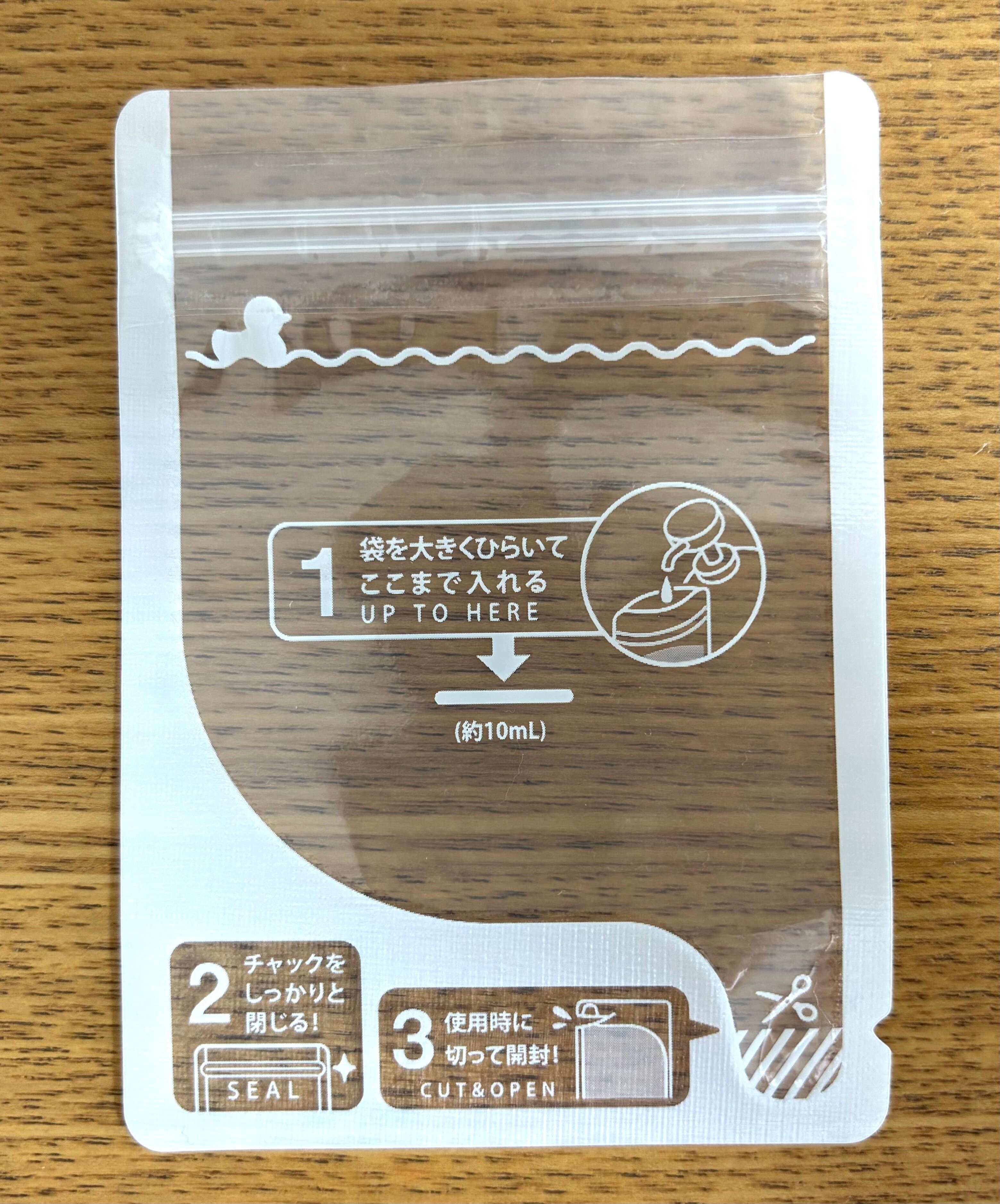 一枚の容量は約10mlで、1の基準の線まで持参したいクリームやシャンプーなどを入れることができます。