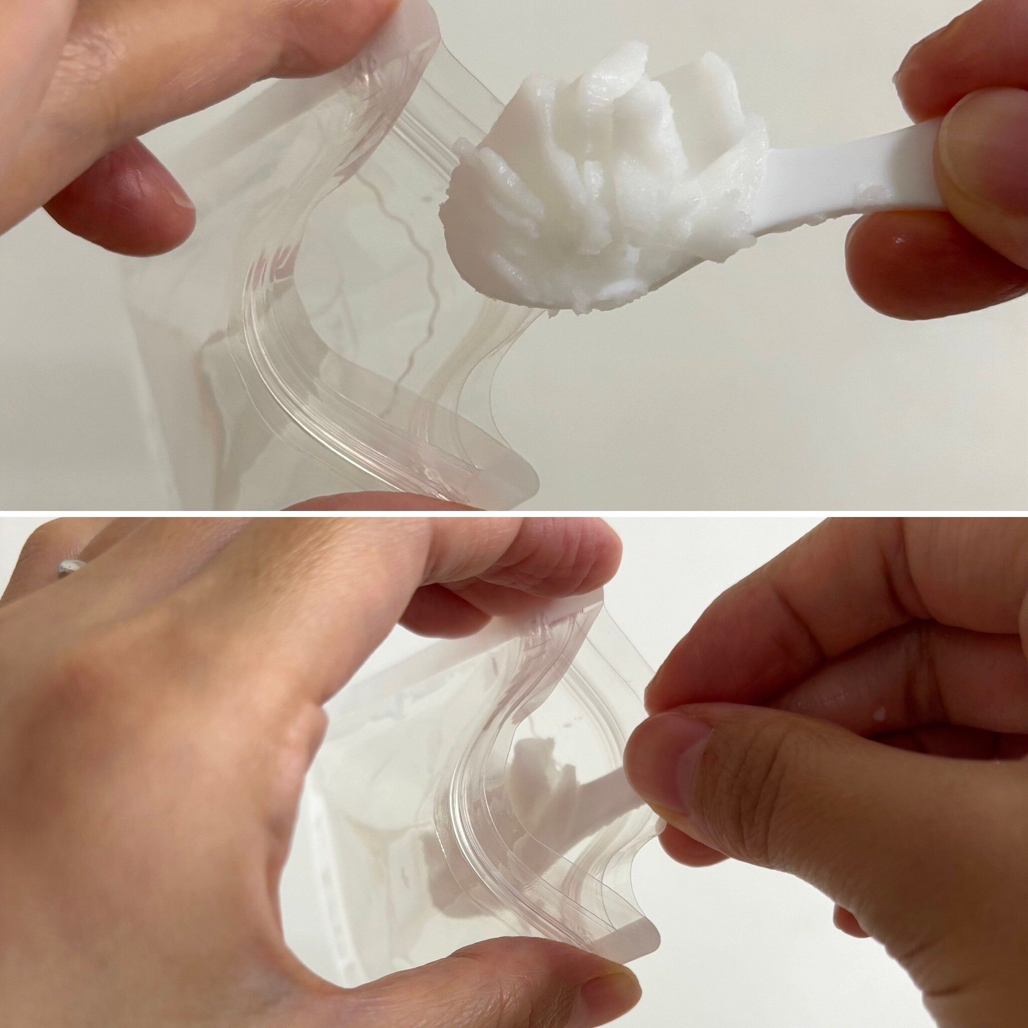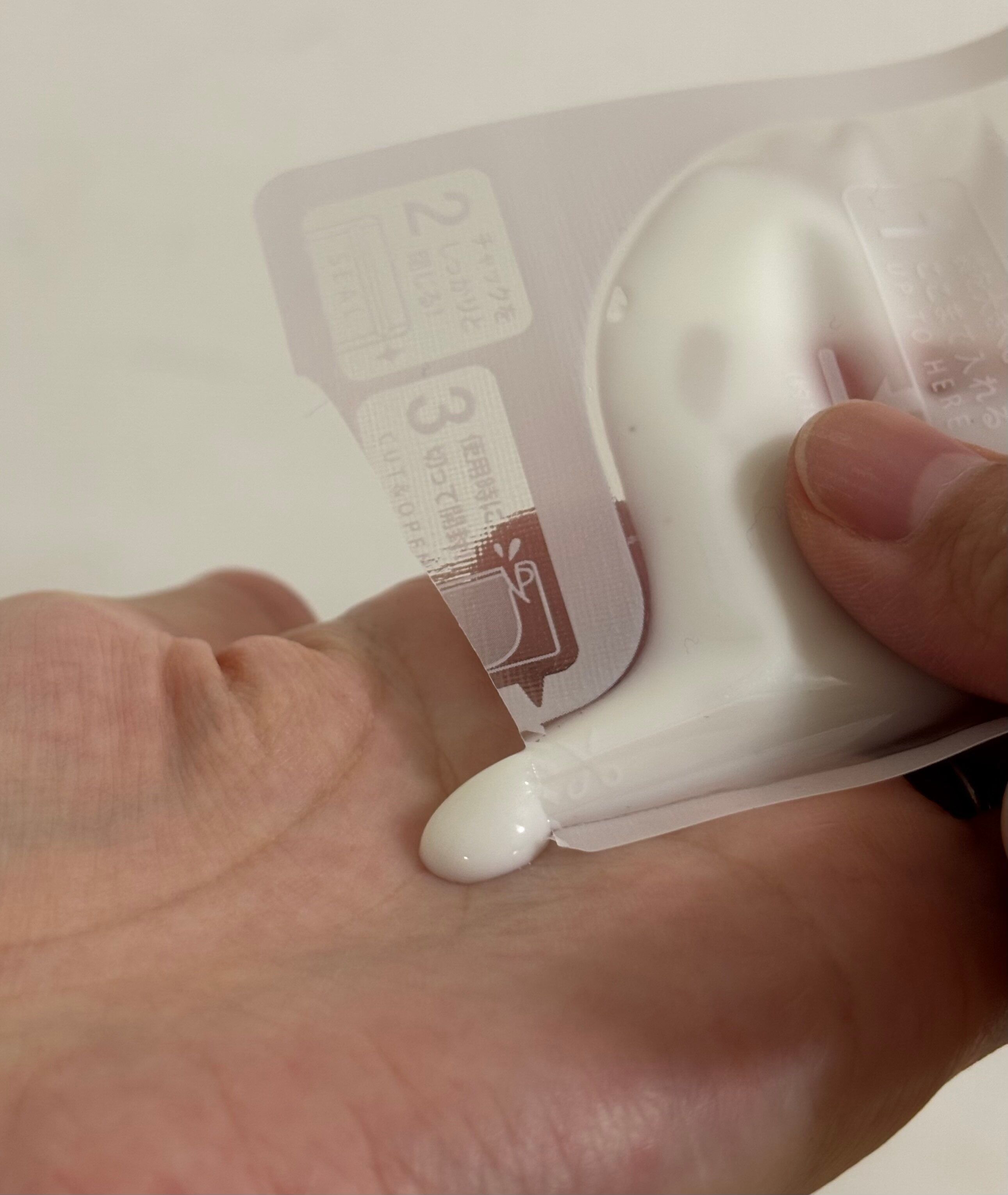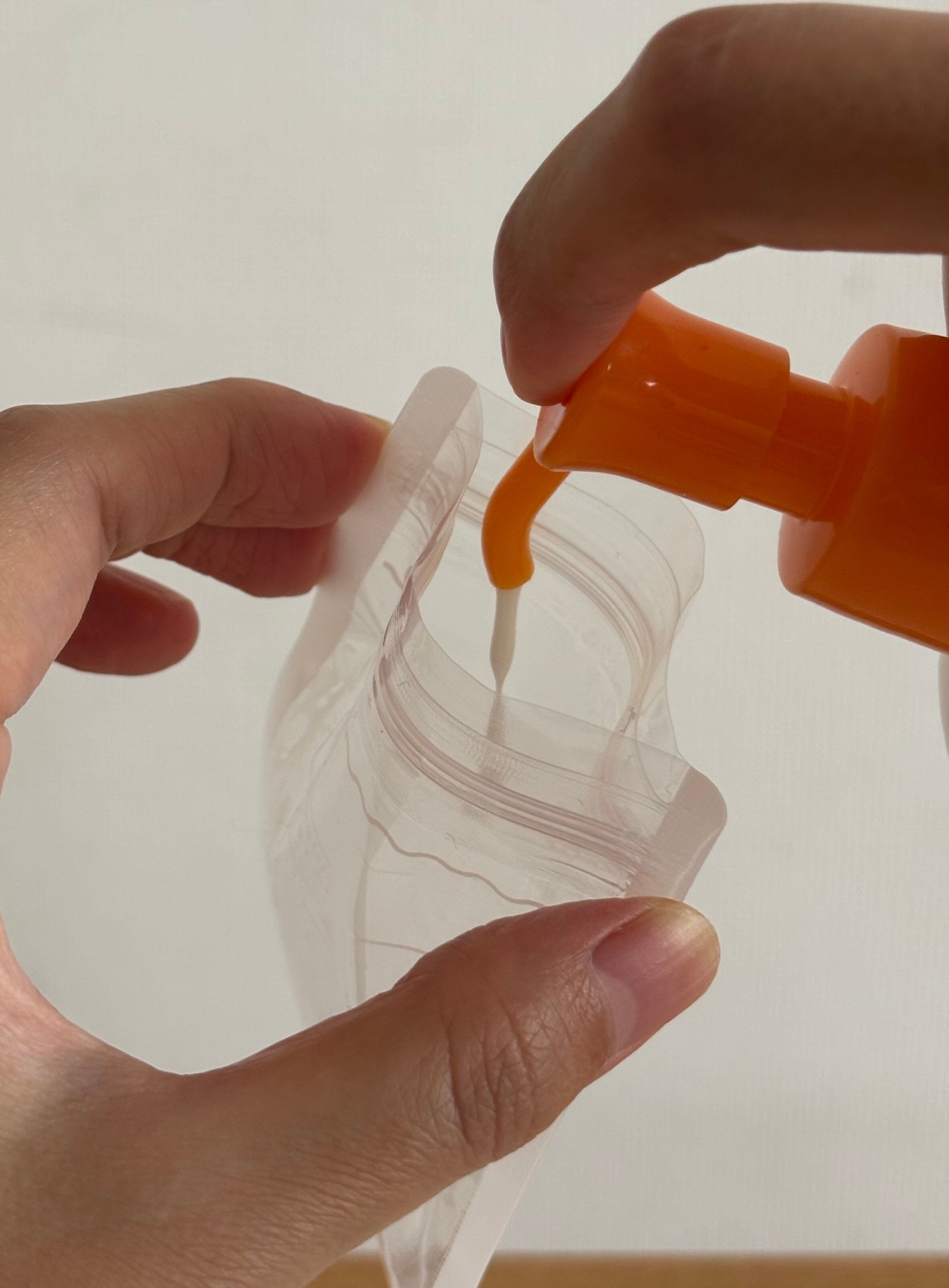 ボトルタイプにはとても入れられないくらい重たいテクスチャーですが、こちらのチャック付きポリ袋の入れ口からスパチュラもすっぽり入るので余裕で詰め替えることができます。