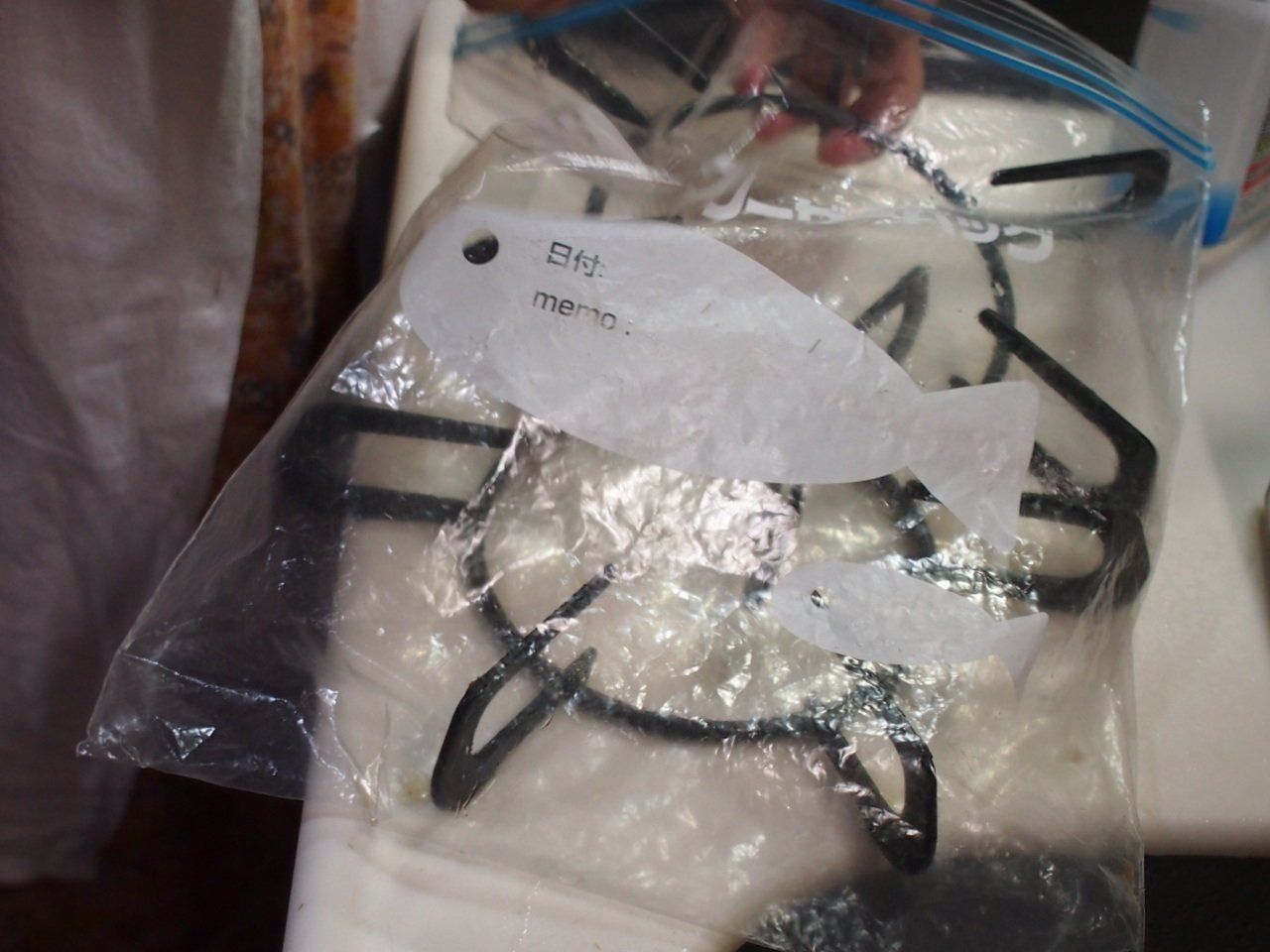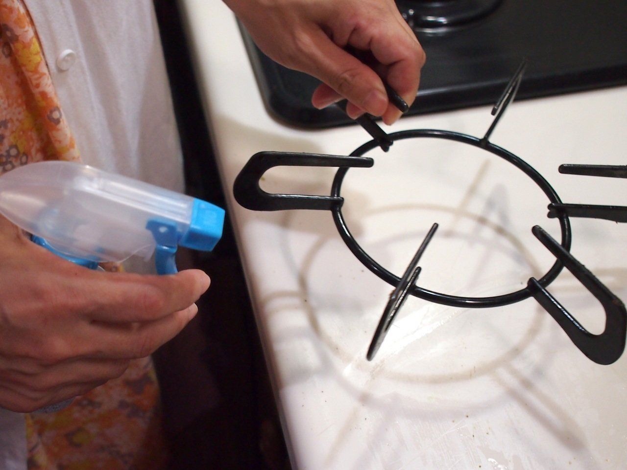 五徳をはずして、「アルカリ電解水」をまんべんなく吹きつけます。そして、レジ袋や使い終えたフリーザーパックなどに、五徳を入れます。こうして、しばらく置いておきましょう。