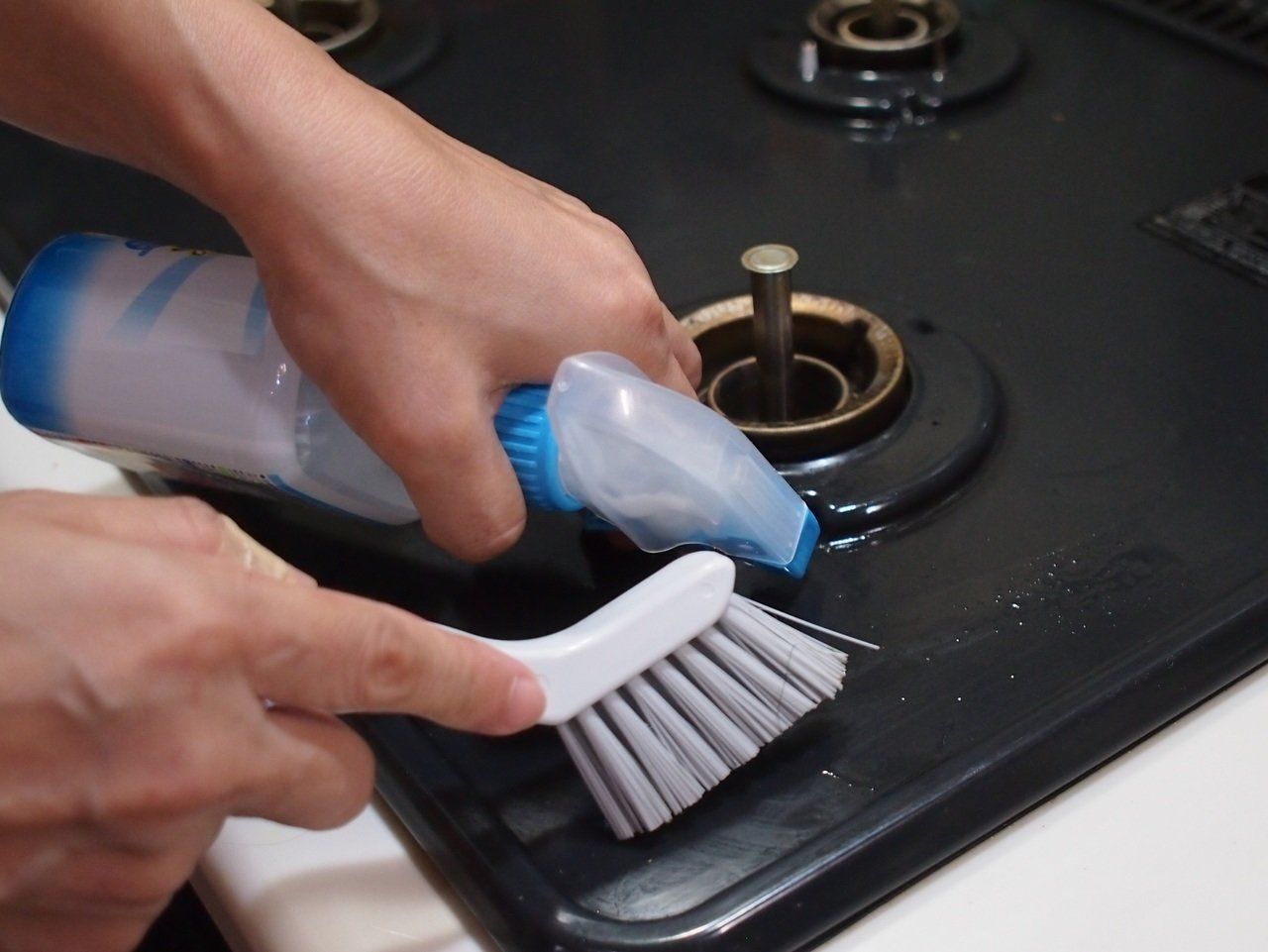 ガスコンロの天板掃除でも、「アルカリ電解水」が活躍。まず、天板全体にまんべんなくかけます。ここで次のアイテム「ツインブラシ」が登場。ごしごしと汚れをこすって、キレイにしましょう。