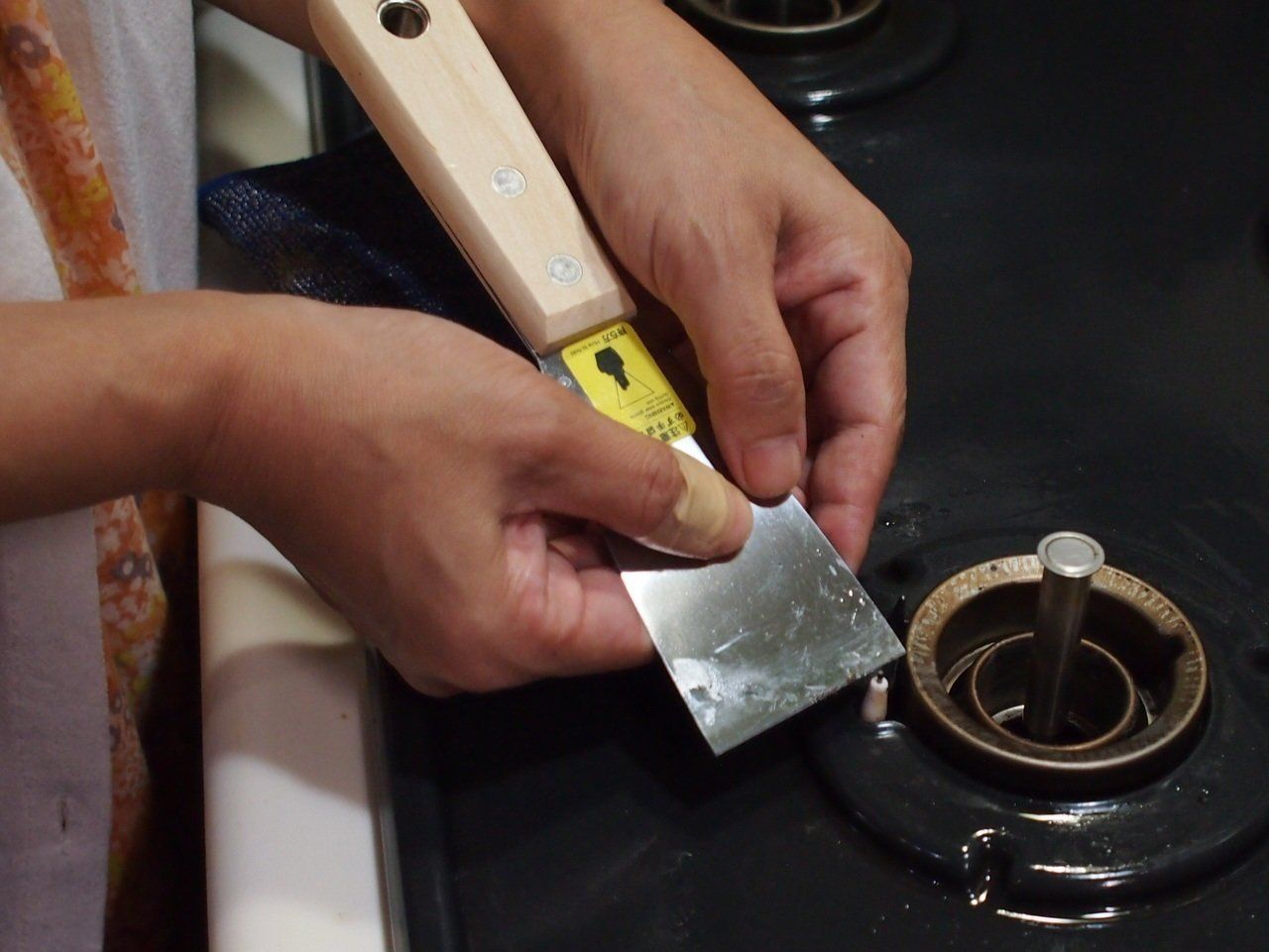 「コゲとりスポンジ」でも落ちない汚れは、「スチールスクレーパー」でピンポイントに除去していきます。そして最後はスポンジ、雑巾などで汚れを拭き取ります。