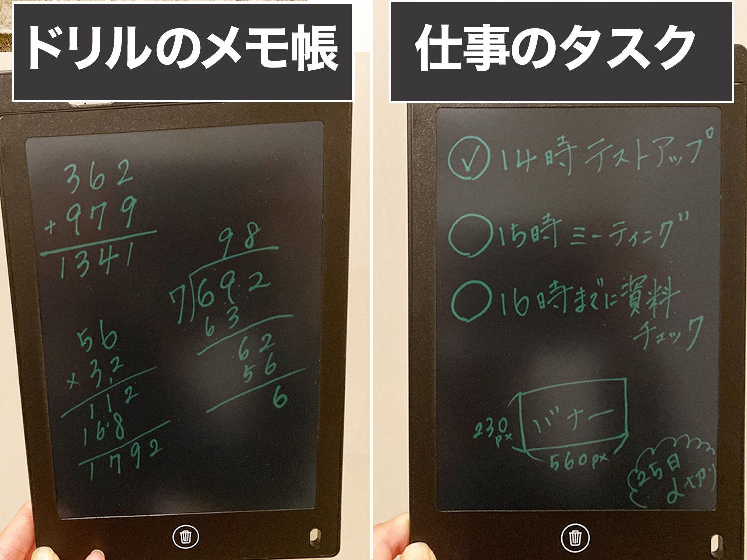 小学生の子供は、算数ドリルの筆算用にメモ用紙を使用していたのですが、この電子メモパッドを使う事で何度も繰り返しで使えるので、紙の節約にも繋がりました!