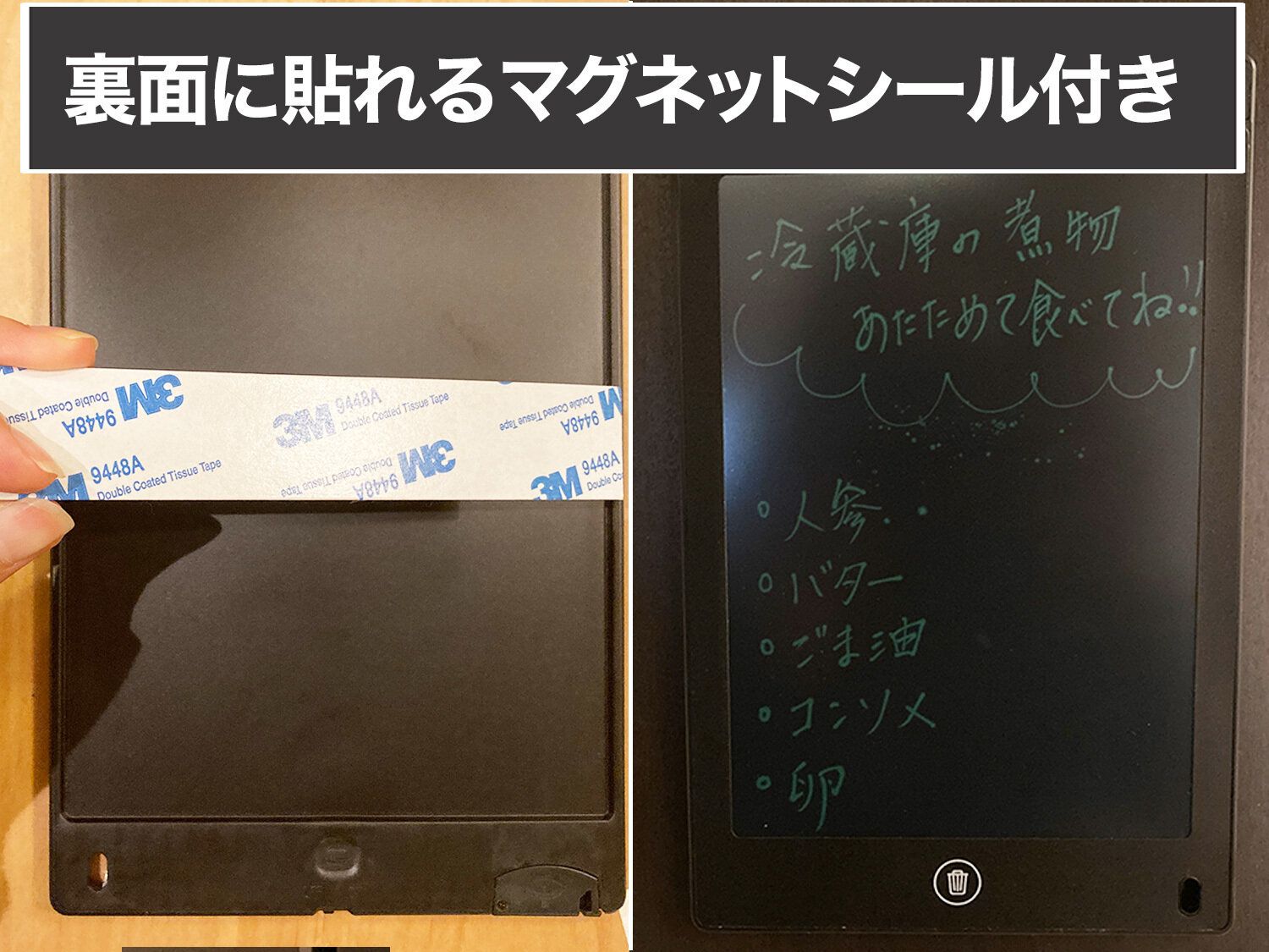 マグネットシールを使用して冷蔵庫などに貼れば、買い物リストに使ったり、献立メモや家族へのメッセージボードとしても使えます。