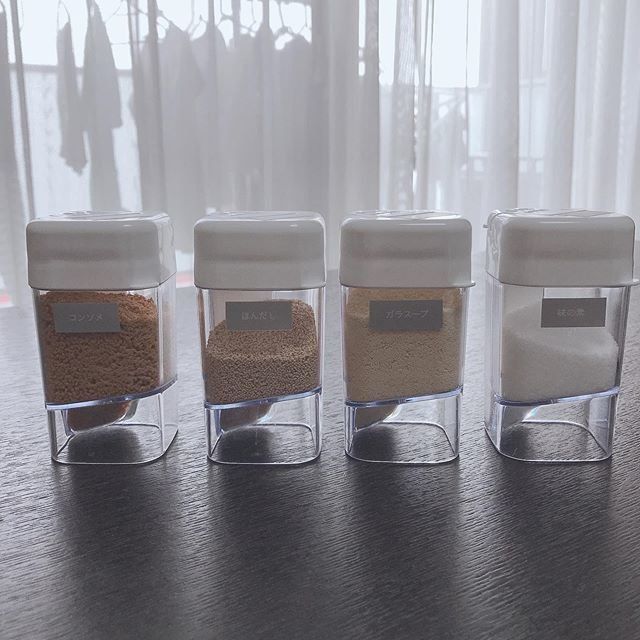 生活感が出てしまいがちな調味料も、100均のそろいのタンブラーに入れれば、まるでカフェのような雰囲気に早変わりします。タンブラーであれば液体も粉も入れられるため、全体を統一させたいかたにはおすすめです。