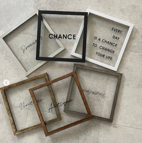 お部屋のインテリア、何かものたりないな…というときは、キャンドゥの「アートフレーム」110円はいかがでしょうか。正方形のフレーム(20cm×20cm)に、色々な書体でオシャレな英字が書かれています。