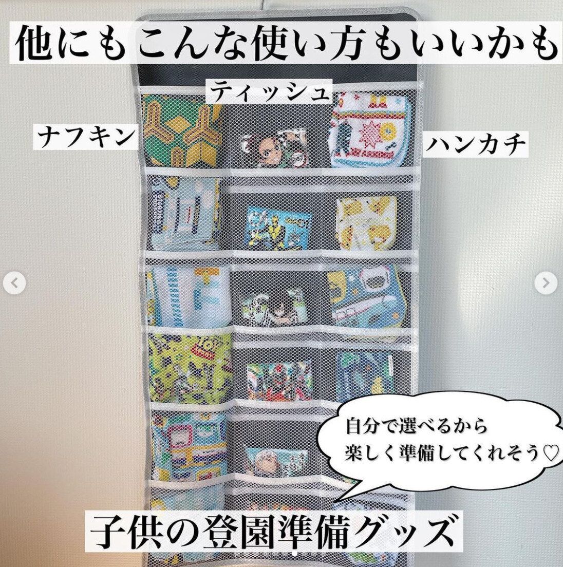 靴下収納のほかにも、ポケットティッシュやハンカチの収納、ミニタオルの収納など使い道はいろいろ。お子さまの登園準備グッズの収納など、頻繫に使用するアイテムをまとめて小分けにインしておくと便利です。メッシュなので中身も見えやすく、取り出しやすい場所に保管しておくと忘れ物も少なくなりそうですね。このほか、下着を収納できる『クローゼット収納(下着用)』もありますので、ぜひチェックしてみてください。